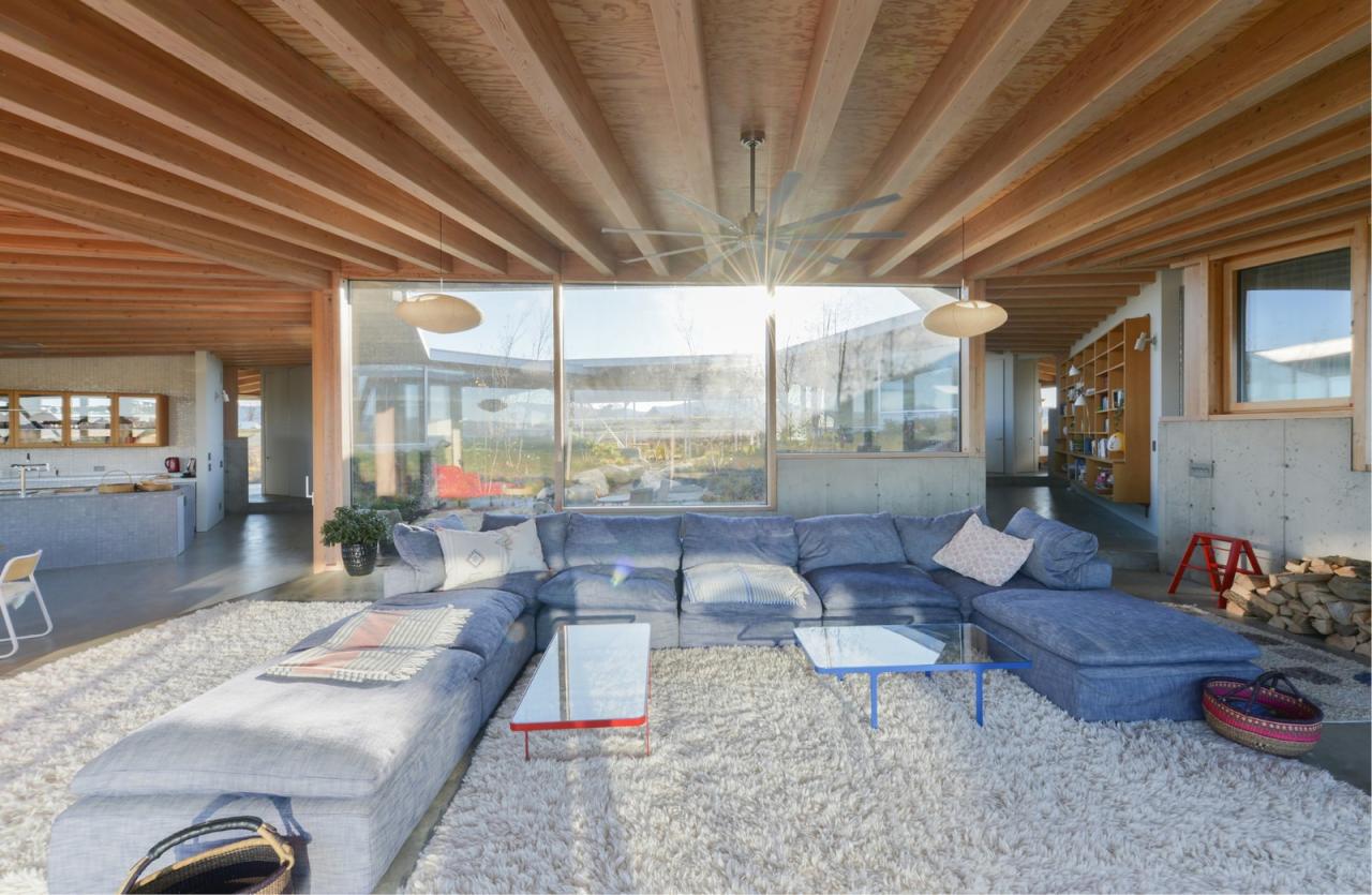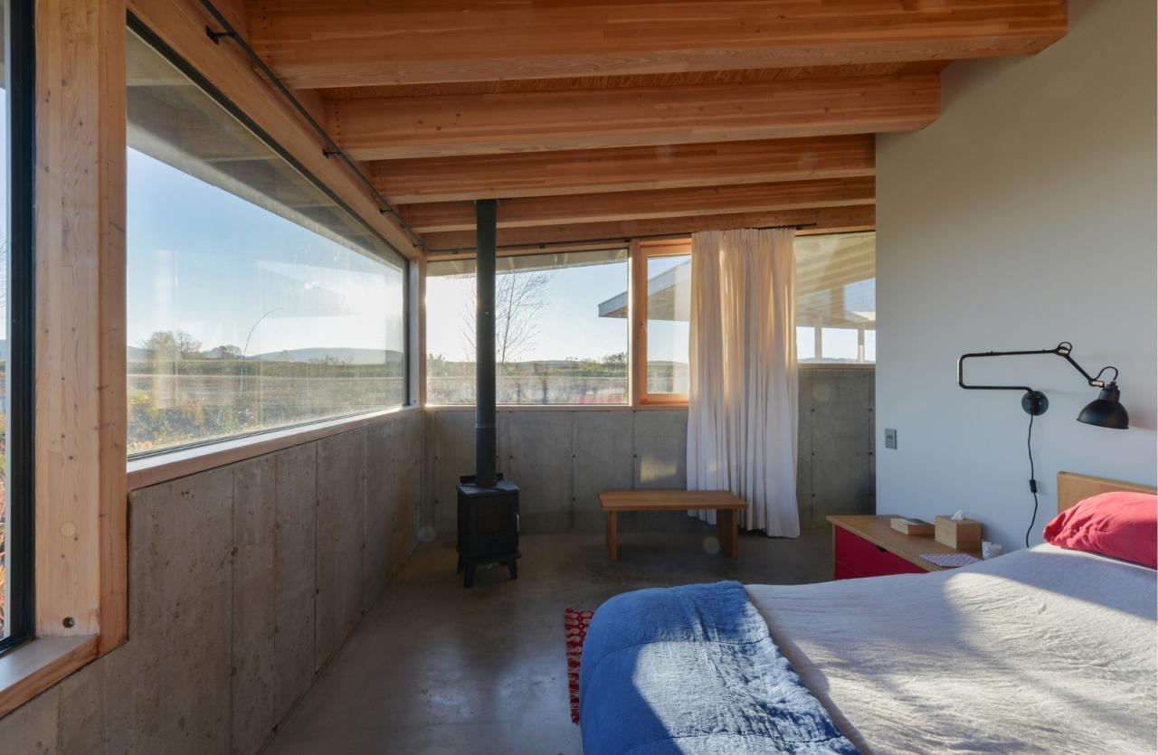 建筑将浴室、储藏室及机械设备设置在上述的结构核心筒中,由此最大限度地探索了可用空间,同时极少化了建筑中的实墙体量。在最终的设计中,无柱的室内空间解放了内部的流线,并保有庭院内部景观与室外远景间的清晰视野。同时,建筑师也在设计过程中不断地整合、清晰化建筑组件可能会有的不同轮廓,从而寻求极简结构体系所能创造的丰富空间体验,并突出了建筑内外的景观及多样的功能区划。