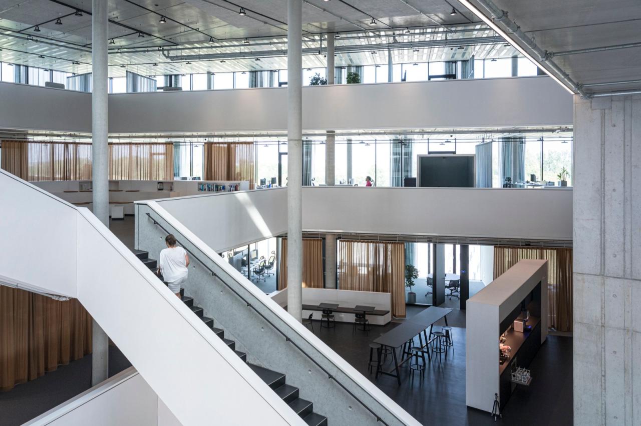 相较于时尚简约的外观,大楼内部采用了原始、裸露和天然的材料语言,诸如裸露的混凝土、未完成的阳极氧化表面和可见的金属面板。工作空间使用了自然色彩和包括木材和织物在内的天然材质。面向中庭的所有表面都涂有白色的声学覆层,以抑制声音并强化漫射的自然光线。青铜色窗帘作为灵活的室内隔断,还创造了适应性较高的空间环境。
