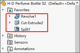 这将在SOLIDWORKS 特征树的最顶部创建一个收藏夹(Favorites)文件夹,其中嵌套了我们的选定项目。通过这种方式,可以在几秒钟内访问草图或者特征。