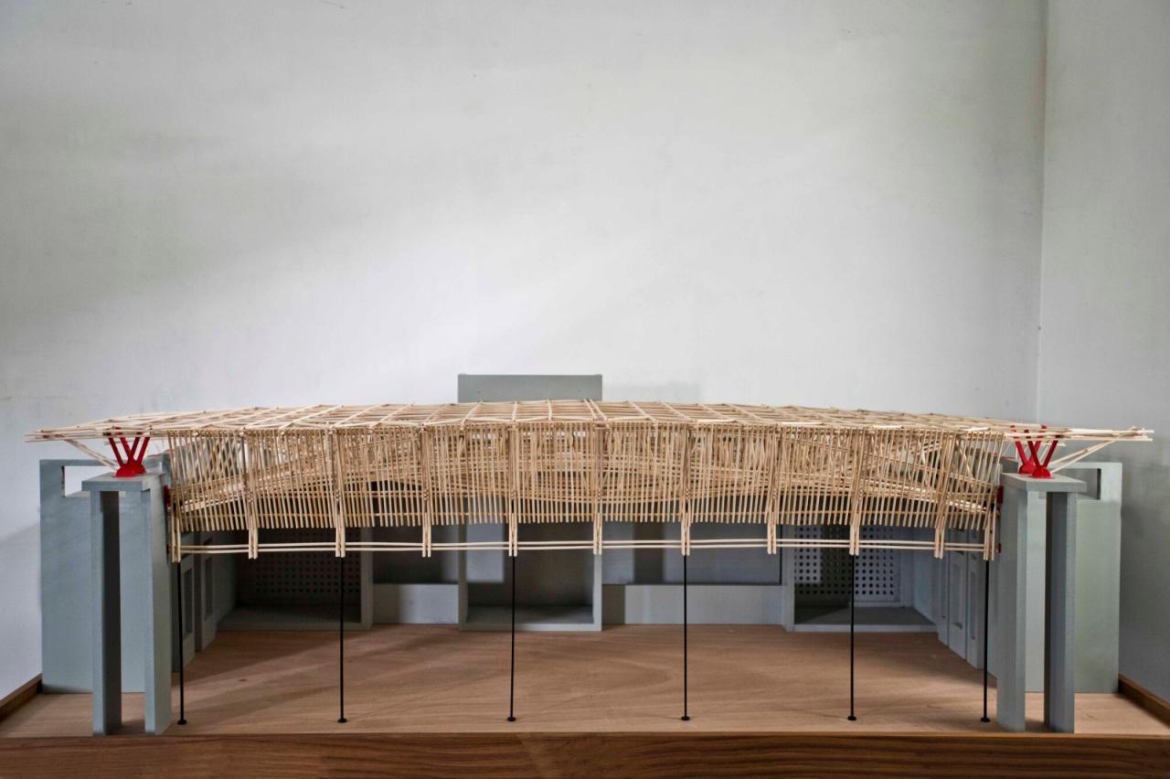 “Yogashala”旨在通过提供一个清晰、流畅、自由和不间断的空间容器(跨度约 78 英尺)来召集瑜伽练习者。由于哈达(Hatha)瑜伽在练习使用了最小的力量达到一个姿势,从而在身体中灌输了一种轻盈的感觉,建筑也在一个系统中使用了间隔的竹子,体现了它的轻盈性,同时仍然有很大的跨度。