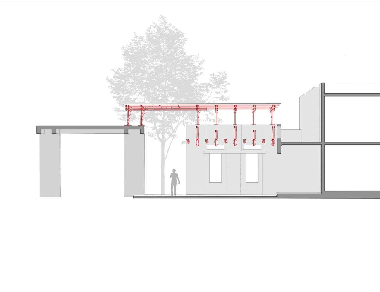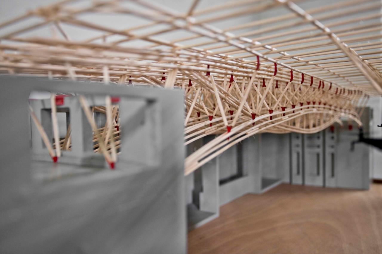 Yogashala 的形式来自于同一材料的拉伸部件的上升性质和压缩部件的下降性质的同步。瑜伽的 Prana(呼吸中的生命力)概念表现在物理空间解释正是这种交替。正如对立面–Purak(吸气)和 Rechak(呼气),在 Kumbhaka(保留)中得到协调,同样,跨度系统的交替上升和下降的曲线,在结构平衡中得到协调。