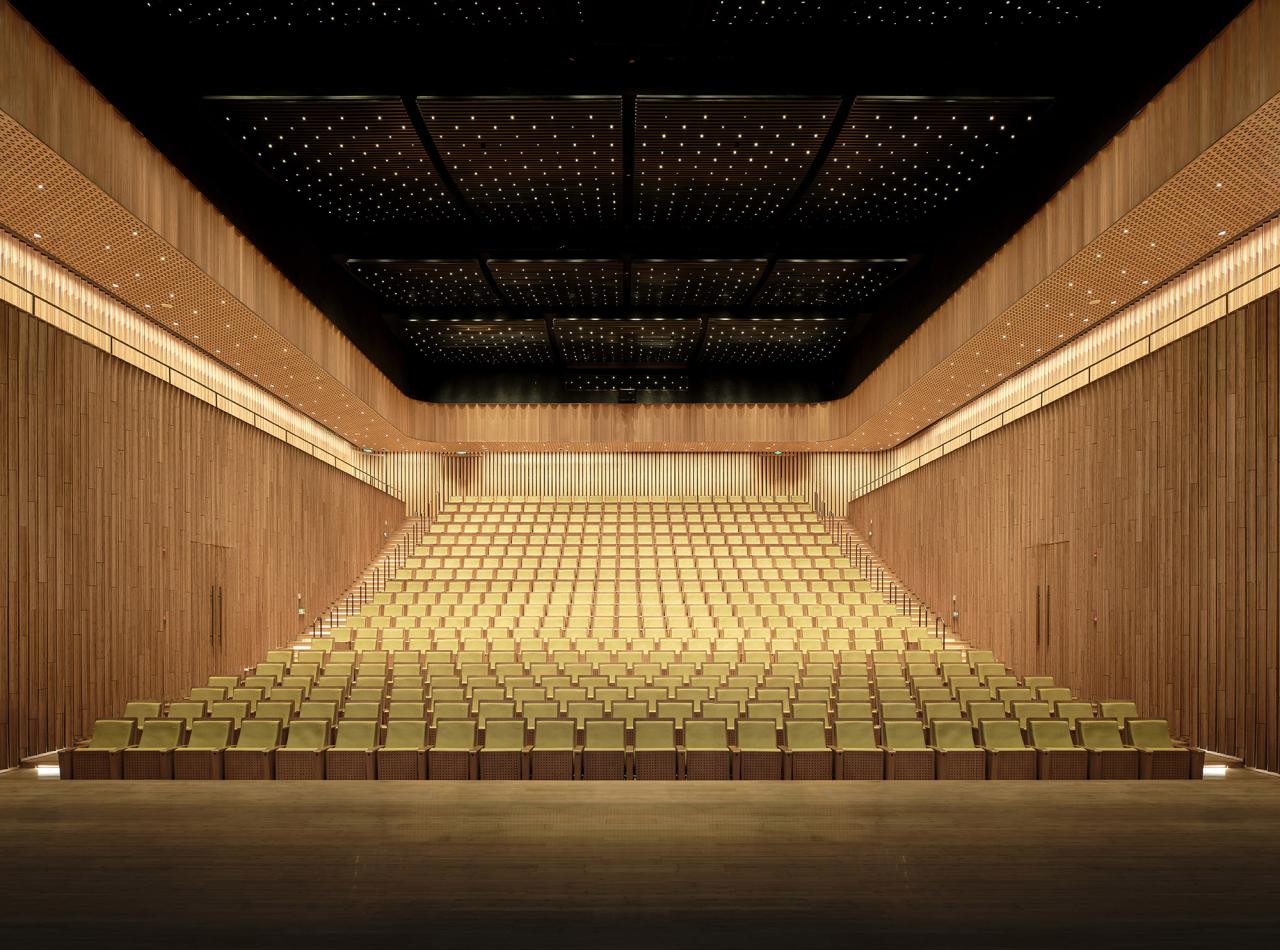 在竹色的主基调中,局部深色编织肌理金属板和金色线条点缀,增添空间层次感。本项目的建筑、室内及景观设计均由goa大象设计一体化完成,照明设计、幕墙设计以及舞台、灯光、声学等其他专项设计也由goa建筑团队统一把控效果,是一次全新而有意义的尝试。