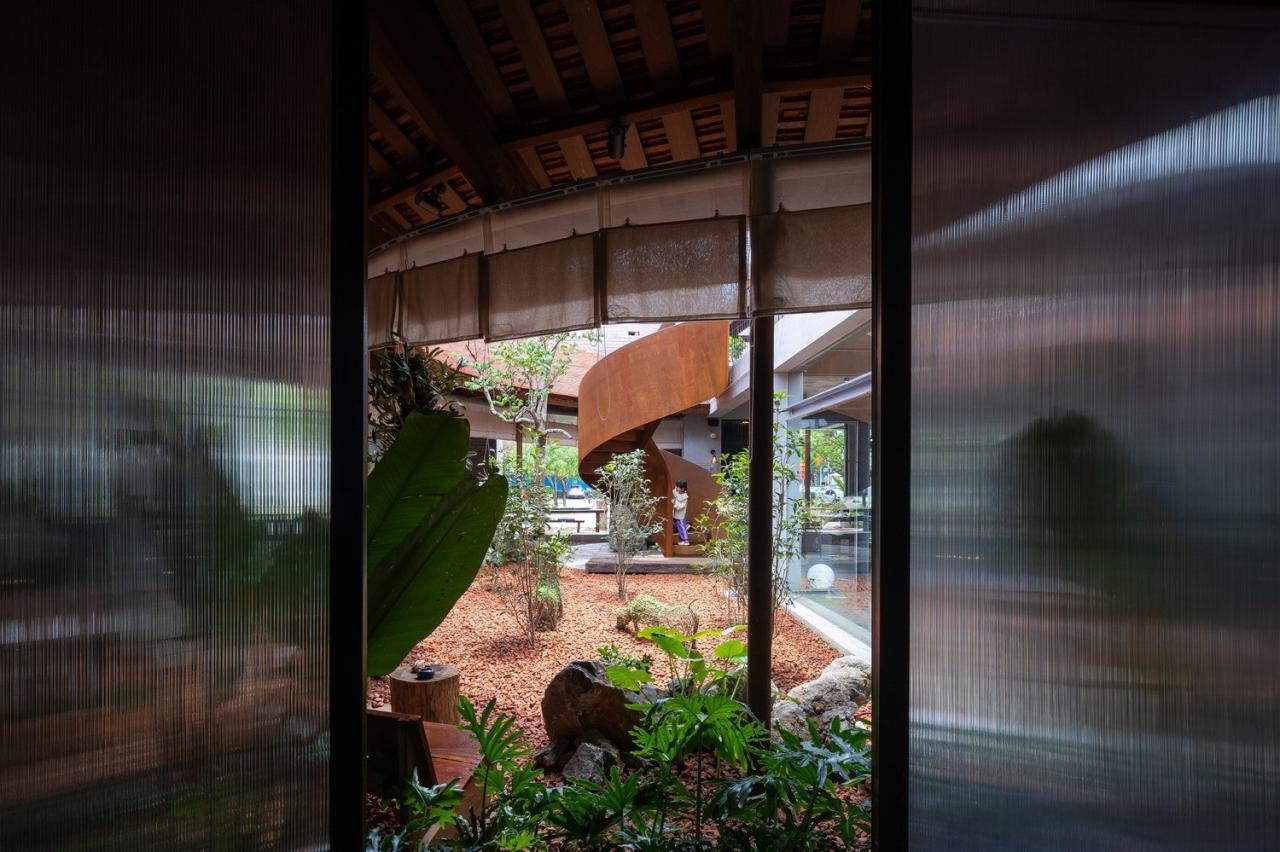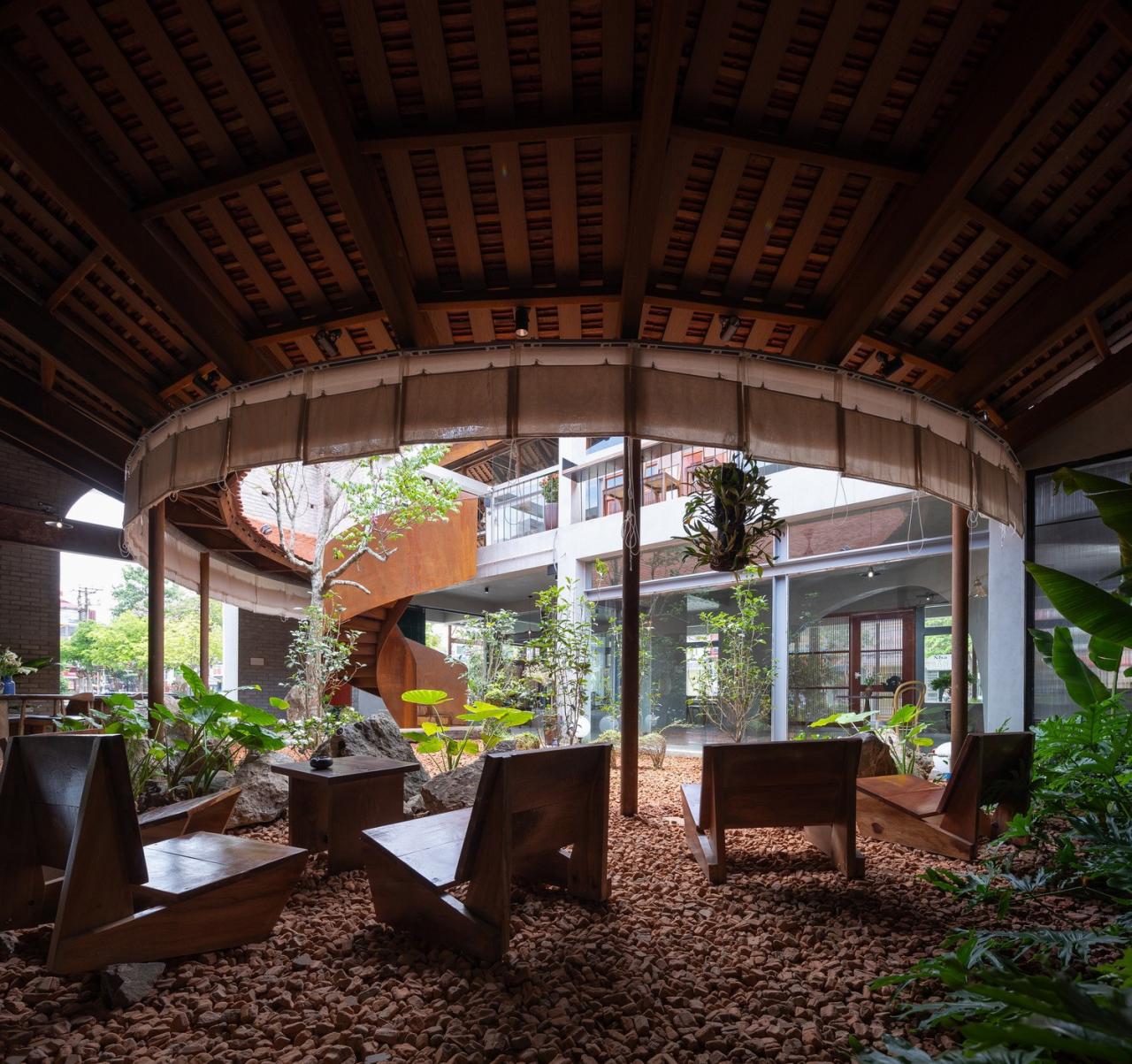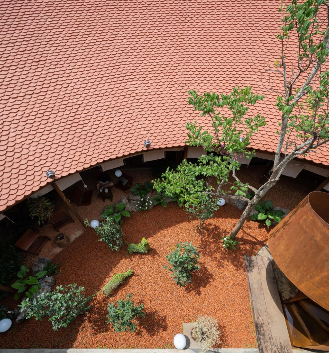 由于双方对咖啡店的共同期望反映了某些越南建筑特色,以及为项目注入了复古的北方建筑感觉,所以选择了鲜红色的鱼鳞瓦片和生锈钢的弯曲屋顶系统作为全新外观的匹配元素。理想的古董感和传统反射不仅体现在类似于寺庙的弯曲屋顶和旧式鱼鳞瓷砖的使用上,还包括宽阔的门廊,红砖鹅卵石,最后是充满熟悉的植物和花香的花园。我们还追求最高水平的简单性,始终避免使用任何不必要的细节。