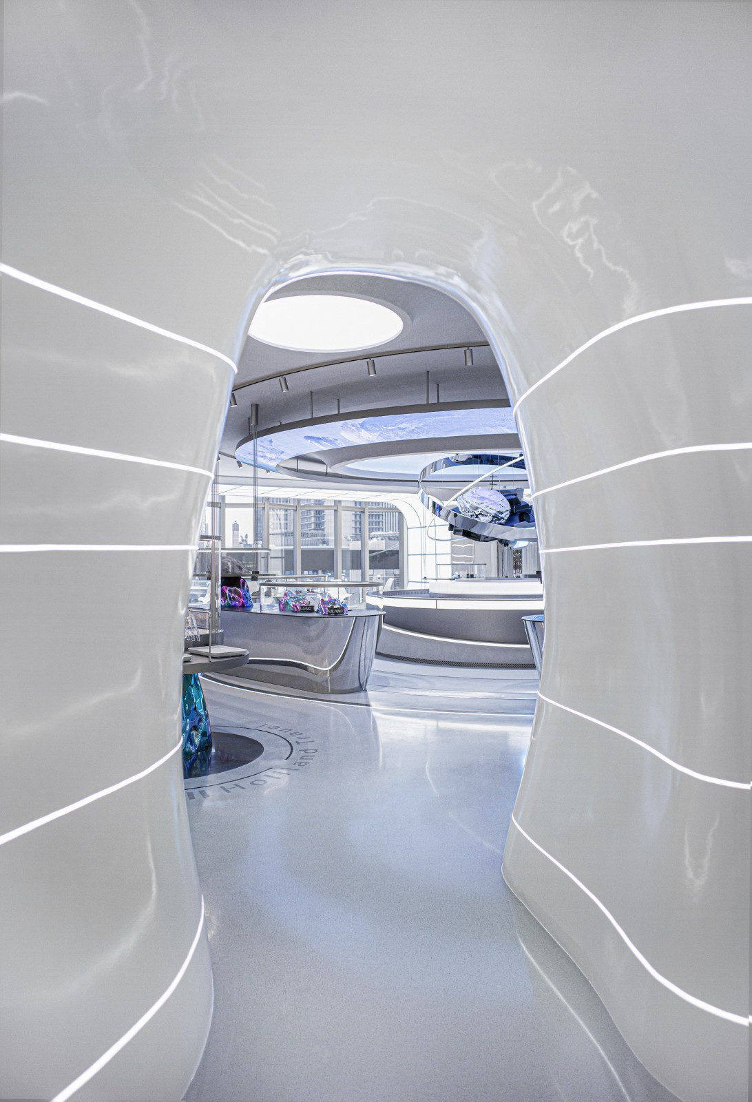 平行宇宙的时空“裂口”在现实世界闪现,空间的扭曲引发了时间感受上的不均匀,线性灯带的无限延展诠释着强烈虫洞的宇宙引力。透过外侧的观测舷窗可以窥探异时空的场景片段,将人拉入对于漫步平行宇宙的想象当中,身在地球,心已入境。