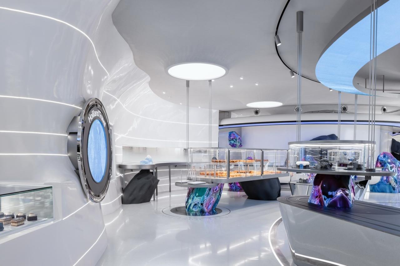 在人类城市文明进化的巅峰之地-上海浦东陆家嘴,Holiland Travel在此登陆,好利来的烘焙创意与SLT未来叙事的空间设计碰撞出无限灵感——金属镜面、陨石吧台、悬浮引擎、异形入侵……传播全新烘焙理念,在带来甜蜜味觉体验的同时邀旅客触碰时空边界,对话未来。