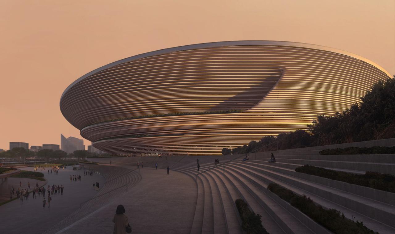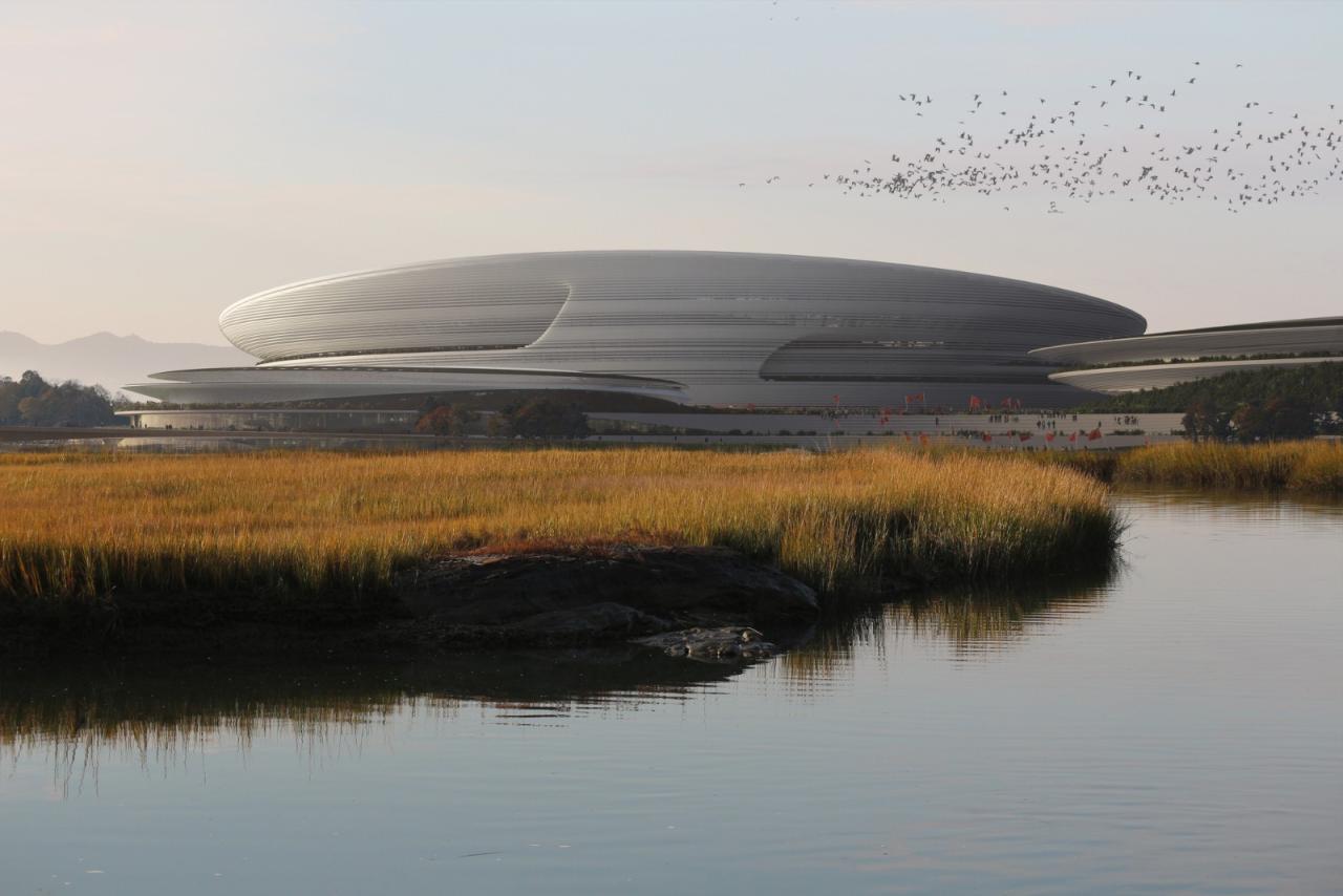 扎哈-哈迪德建筑事务所赢得了新杭州国际体育中心设计竞赛。杭州未来科技文化中心国际体育中心以60000座的足球场及练习场为核心,并还囊括了包含19000个座位的室内竞技场、带有两个50米游泳池的水上运动中心及其他配套设施。项目坐落在杭州的未来科技文化区,并且将为杭州建设全新的滨水公园、公共广场等空间。同时,国际体育中心还将与杭州正在扩张的地铁3号线、5号线直接联通。杭州作为世界领先的电子商务中心之一,汇聚了众多中国最大的科技公司,并吸引了来自全国各地的IT专业人才和企业家来此生活、工作。