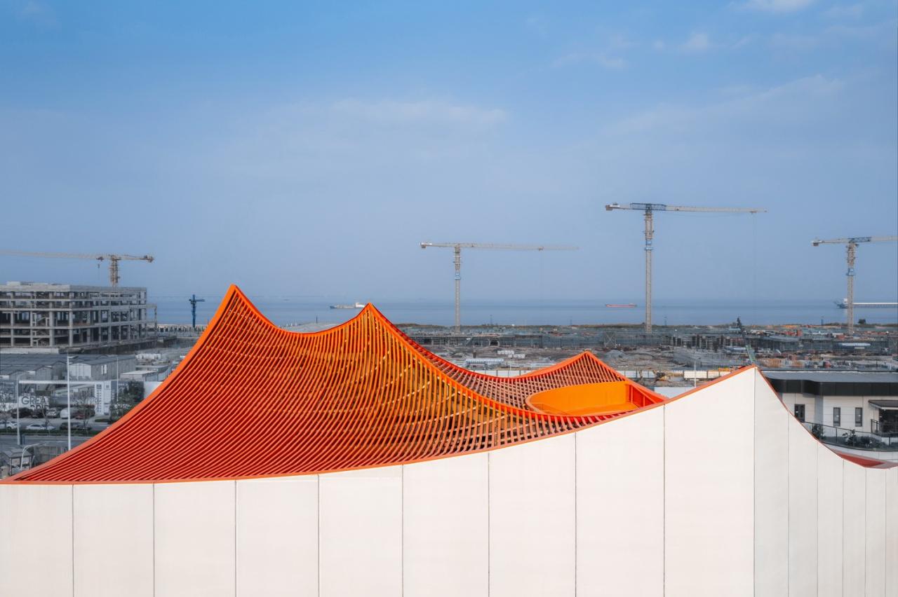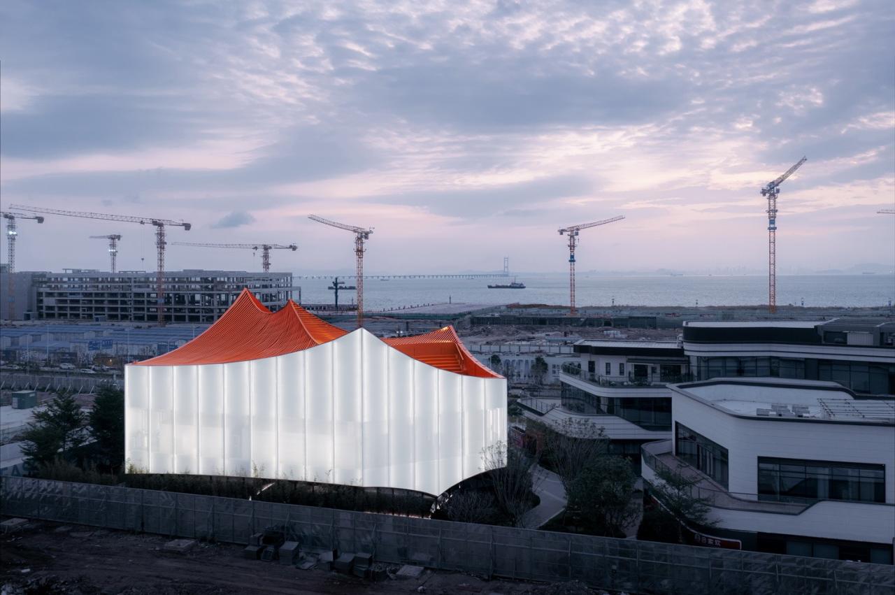 Wotopia Lab为万科深业的未来之门-湾中新城项目设计的半透明的被称为“飞翔的红山”的大湾区中心展览馆,于2022年7月落成开放。它坐落在珠江三角洲的西岸、深中通道的西大门处,处于湾中新城的滨海一线。天气晴好之时,可以从屋面直望大海另一侧的深圳前海的壮观的高楼群。这个雄心勃勃的展厅是一座漂浮在海边的新城新地标。