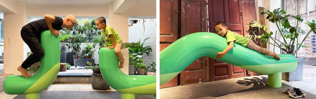 景观装置新沙小学入口台阶上匍匐着几只行走中的草绿色“小动物”,既像扶手,又像雕塑,一点儿也不“建筑”。这样的“小动物”躲藏在校园大大小小的公共空间里,等着学生们找到它们一起玩。其原型来自于一十一建筑在深圳玉田村社区营造项目中设计的5个特殊形状的座凳,在城中村的都市丛林里和大家捉迷藏。新沙在此基础上发展出一共49件形态各异的景观装置。我们在校园设计些装置有两个意义:首先,这些装置既可以作为景观家具或游乐设施使用,又可以创造交流的场所,在与之互动时,孩子们用自己的身体感知空间,自由地创造游戏,并学习如何与同伴交流;第二,这些装置创造了适合儿童尺度的空间。从孩童视角来看,空旷的建筑显得过于庞大而单调,而景观装置则可以在尺度上连接大的建筑空间和小的孩童身体。