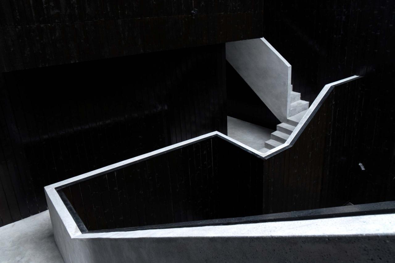 “转折”那园林如何建构和模拟一个自然世界,自然的本质是变化,而转折是变化的最基本单元,庭院步道的转折、建筑体块的转折、竖向交通的转折共同建构出一个流动、变化的复杂空间体验。二维到三维的转折,将整个建筑的室内外流线传串连折叠起来,有点像是园林里攀爬假山的体验,复杂交错的流线极富趣味。转折首先是线性的,所以它是一个整体,但它又是流动的、错位的,所以在两侧布置的空间既相互关联又相互区隔。整个建筑体块是一个三维的转折流线,户外楼梯、走廊从平面到竖向做了很多转折的串联,使得在建筑中游走产生了许多变化的视野和景观,增加了整个建筑的趣味性。