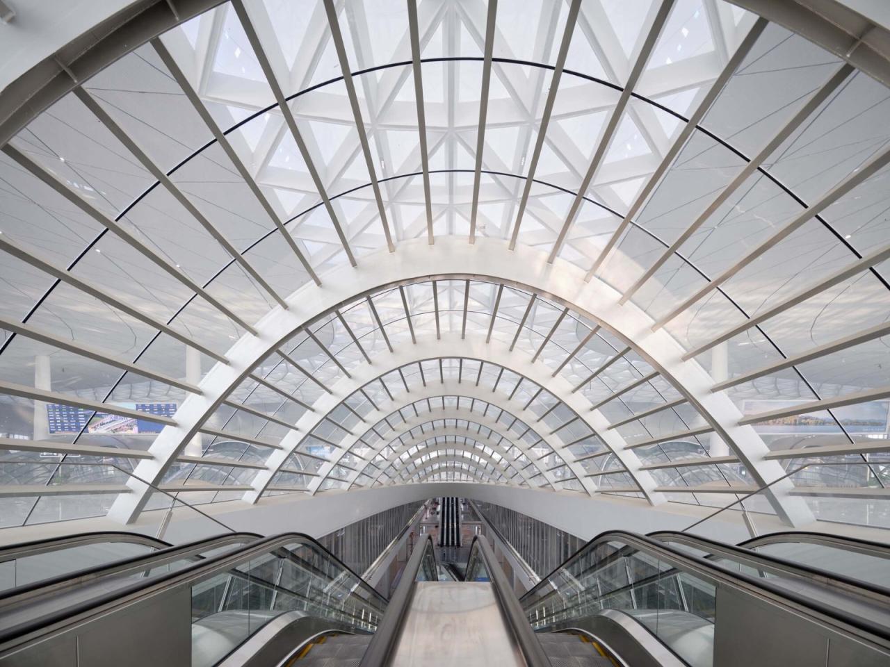 云谷—高效的中央换乘系统杭州西站利用站场拉开的新空间形成28米宽的进站通廊,将传统火车站“两端进站”的进站方式化零为整成为“中央进站”。通过各种接驳方式而来的旅客集中在云谷中部,再乘坐专用扶梯直达候车层。采光天窗使阳光透过拱形玻璃穹顶,引入了充足的光线,可直达地铁层。大量自然光线的引入使得站内空间通透明亮的同时,也对旅客进站的路径产生引导作用。与传统进站模式相比,旅客进站时间可以缩短一半以上,进站效率显著提升。