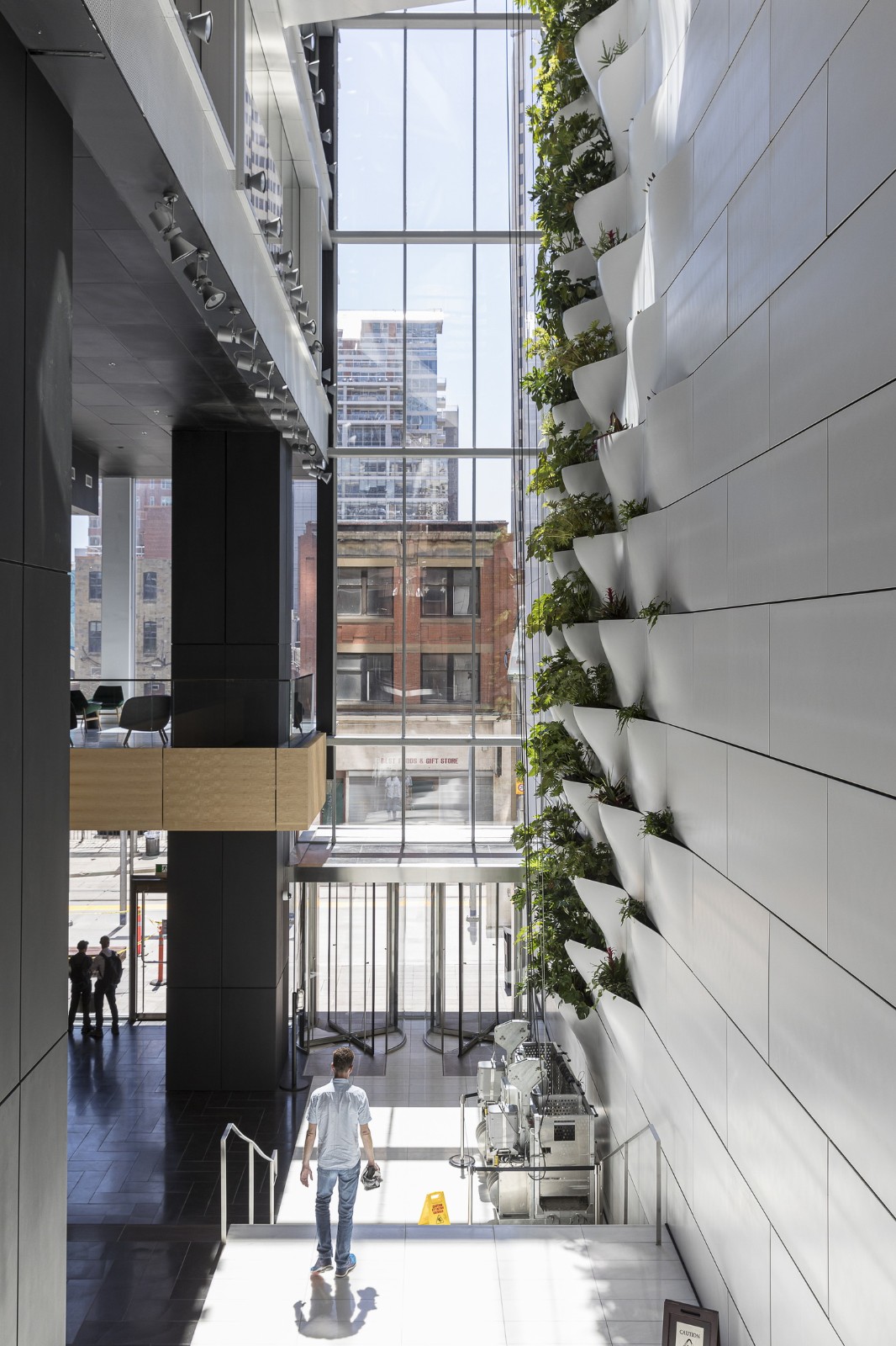 塔楼沿着地面层的正交性、借由对角线的移动创造了像素化的立面,为住户提供了露台和阳台空间。主入口上方的立面像素则延伸到了场地之外,创造了一系列的檐篷、平台和交织于拐角处的休息室空间。而在夜间,由 Douglas Coupland 打造的 15000 平方米“北极光”艺术装置则会照亮塔楼的南北立面,使其成为卡尔加里最大的公共艺术作品。