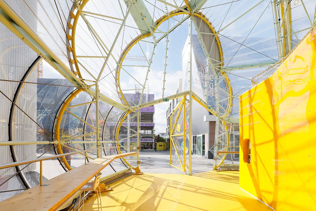 市场通过尽可能透明的状态来彰显其亮眼的形态外观。建筑师采用了一个非常轻质的金属结构,并以绷紧的透明 ETFE 膜覆盖结构的中央脊柱,并在其中设置了摊位和座位区。这一透明脊柱就是市场本身。