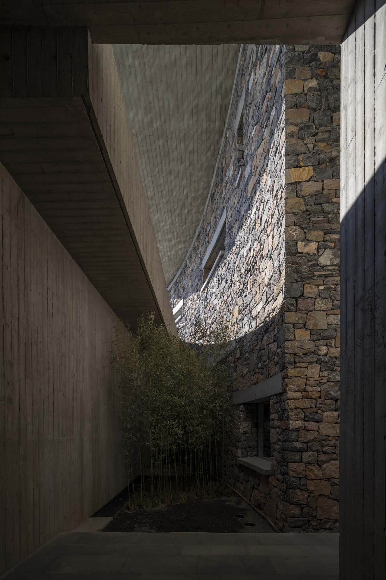 这组建筑的结构体系也缘于当地传统住宅的当代转译,即用钢筋混凝土柱拉扯下垂的混凝土双曲面屋顶的张拉结构和石砌筑墙体的结合,映射粗石砌筑与木构架结合的结构体系。屋顶的形式,不仅唤起人们对当地建造方式的记忆,更让人联想起类似 4 根柱子拉扯出的帐篷的原型。巨大的混凝土双曲面屋顶,因为重力而塑造出的自然下垂曲面,在屋顶和地面之间产生了诗意的张力。
