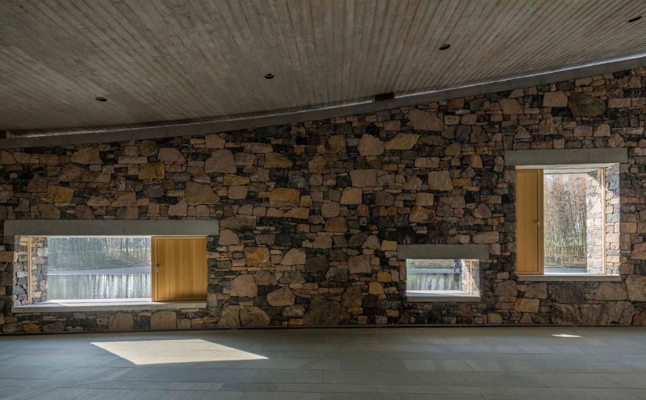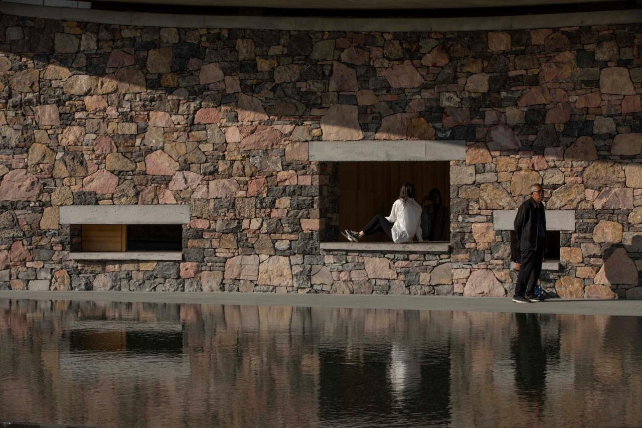 淄博是一座历史悠久的城市,是齐文化的发源地。这里山峦起伏,广博粗放的自然条件不仅培育了当地人硬朗、豪放的性格,也塑造了当地建筑质朴、粗犷的品质。当地传统民居大多以粗石砌筑作为围护结构,包裹木构架结构,以抵御寒冷的北风;也有以粗石砌筑厚厚的墙体作为支撑结构,承载木构架屋顶。与北方其他地域的传统民居近似,三间一房、三或四房合院,每一房均以三面实墙,一面开放,形成内向的居住类型。如果合院、石砌筑是当地千百年来生长出来的建筑类型和建造方式,那么这种类型和建造方式一定会是朴素、真实、智慧的生态建筑的原型。华侨城艺术中心也正是基于这样一种原型发展而来。一方面,它尊重地域文化、气候、建造传统;另一方面,在当代建筑的语境下,我们更加专注对建筑形式的结构性生成,以及材料和结构体系之间关系的思考,即结构和材料的诗意化表达的实验性探索。