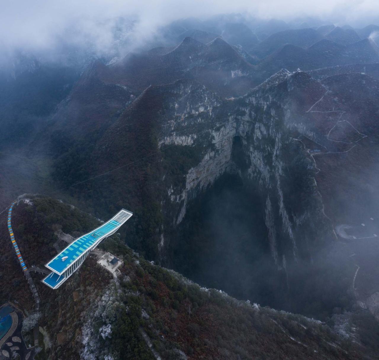 喀斯特地貌分布在广西、贵州、重庆等地,其中广西分布最为广泛。喀斯特(KARST)即岩溶,是水对可溶性岩石进行以化学溶蚀作用为主,流水的冲蚀、潜蚀和崩塌等机械作用为辅的地质作用。桂林山水即是喀斯特地形的典型表现。侵蚀形成的溶洞天坑等地理景观。乐业县大石围天坑群是世界上最大的天坑群,被誉为“世界天坑博物馆”。云海天舟项目正是为体验这种大尺度地理奇景。观赏峡谷大尺度地理景观的典型案例,美国亚利桑那州科罗拉多大峡谷观景平台,悬空的甜甜圈造型将建筑的凌空感和旅游动线相结合。山西悬空寺建筑与崖壁融为一体,中国山水画情境的再现。大石围天坑的崖壁距离山顶被植物覆盖,想要体验天坑的凌空感,需要使游客接近或超出崖壁。如果采用甜甜圈造型,后部需要巨大的支座平衡前端重量。