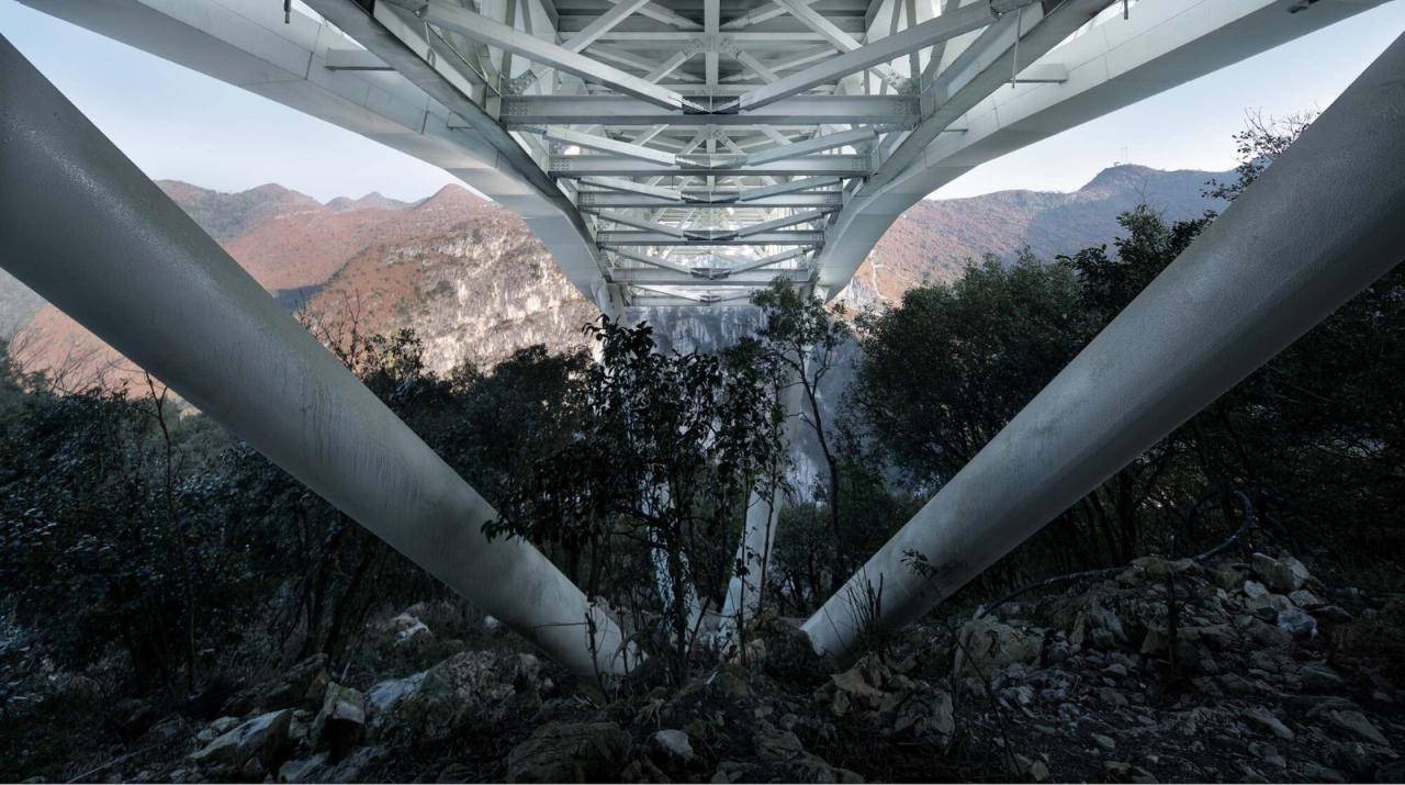 建造过程考虑到喀斯特地形存水困难,当地植被生长缓慢,生态条件脆弱,在山脊非常有限的场地内建造一座80米长,10米宽的观景建筑,三座塔吊接力将预拼装构件吊装至山顶,最终完成建造。云海天舟的设计在自然景观保护与利用的两难之间,从设计理念与技术的角度给出了一种解答。技术的应用不单是为了实现悬挑尺寸的数字指标,应对设计目标技术的内在碰撞与设计理念的契合,自然形成了设计的最优解。让更多的人能够体验到喀斯特地形天坑带来的震撼性体验。建筑以一种高调的姿态谨慎的应对脆弱的地质条件,强烈的视觉形象背后则是谨慎分析之后的理性回应。山谷间实现34米悬挑是建筑结构的一次大胆尝试,放眼整个天坑群,云海天舟仅仅是山间渺小的一叶小舟。