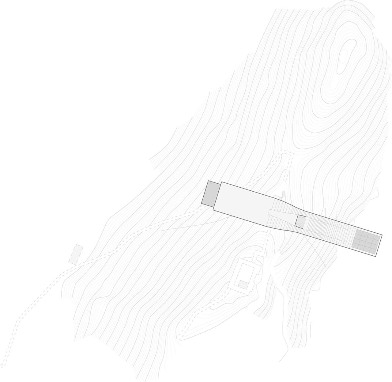 完成34米的悬挑尺寸仅仅是设计面临的挑战之一,平台的变形度、振幅控制,为了保证安全的心理感受,为设计增加更大的难度。山脊顶部400米长的裂缝是项目最主要的不稳定因素。除了灌浆处理,建筑的支座设计向内倾斜,水平分力提供山脊环抱力,增加场地的稳定性。建筑结构一体化的设计方法,结合结构设计原理,将变形最大的部位向颈部后移,悬挑最前端的变形反而更小。液态阻尼箱的采用进一步控制了振幅与振动频率。减少垂直力对山体的破坏,建筑的自重尽可能减轻到基础开挖的岩石相同的重量。观景平台主体结构采用空间钢桁架结构,前端栏杆作为桁架结构的一部分,使前悬臂尽可能的轻薄。通过增加支柱长度,实现了前悬臂结构的预应力拱形结构,同时对静载和部分活载下的挠度进行补偿,这也保护玻璃免受大的变形。结构系统和构件的布置适应了力的分布,与建筑几何完美对应。
