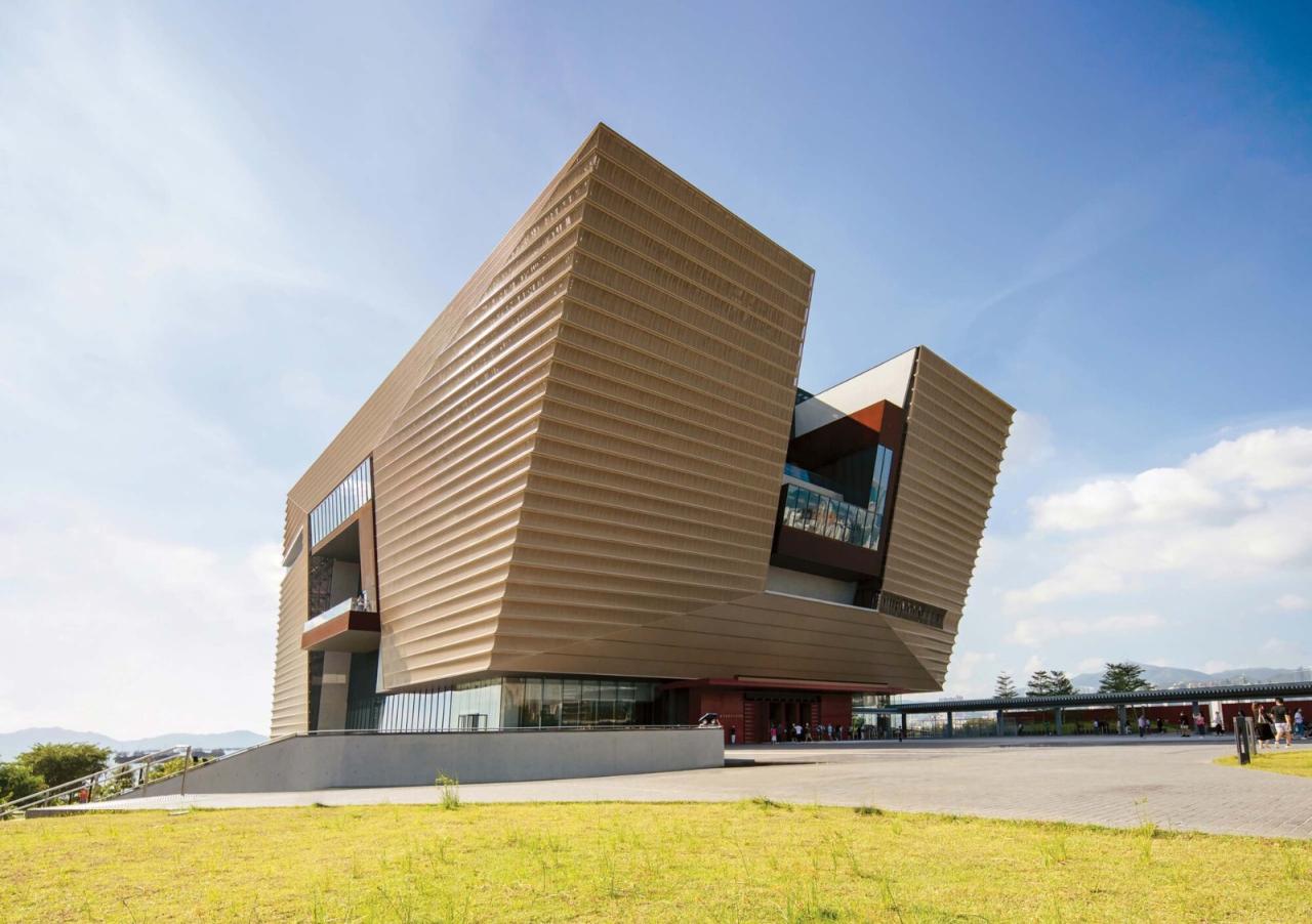 博物馆总建筑面积达30,000平方米,坐落西九文化区的西端海旁,毗连艺术公园,维多利亚港海景一览无遗。设计以博物馆积极向现代观众推广中国传统文化的理念出发,以当代建筑语言重新演绎中国传统空间概念,参照了北京故宫里院殿沿中轴水平递进的空间布局,利用三个中庭空间层层迭加塑造出连贯的楼体,引导访客穿梭各个楼层。另方面,垂直递进的中庭空间设计呼应香港高度密集的城市肌理,巧妙地令地面层得以最大程度保留开放空间和绿化园境。