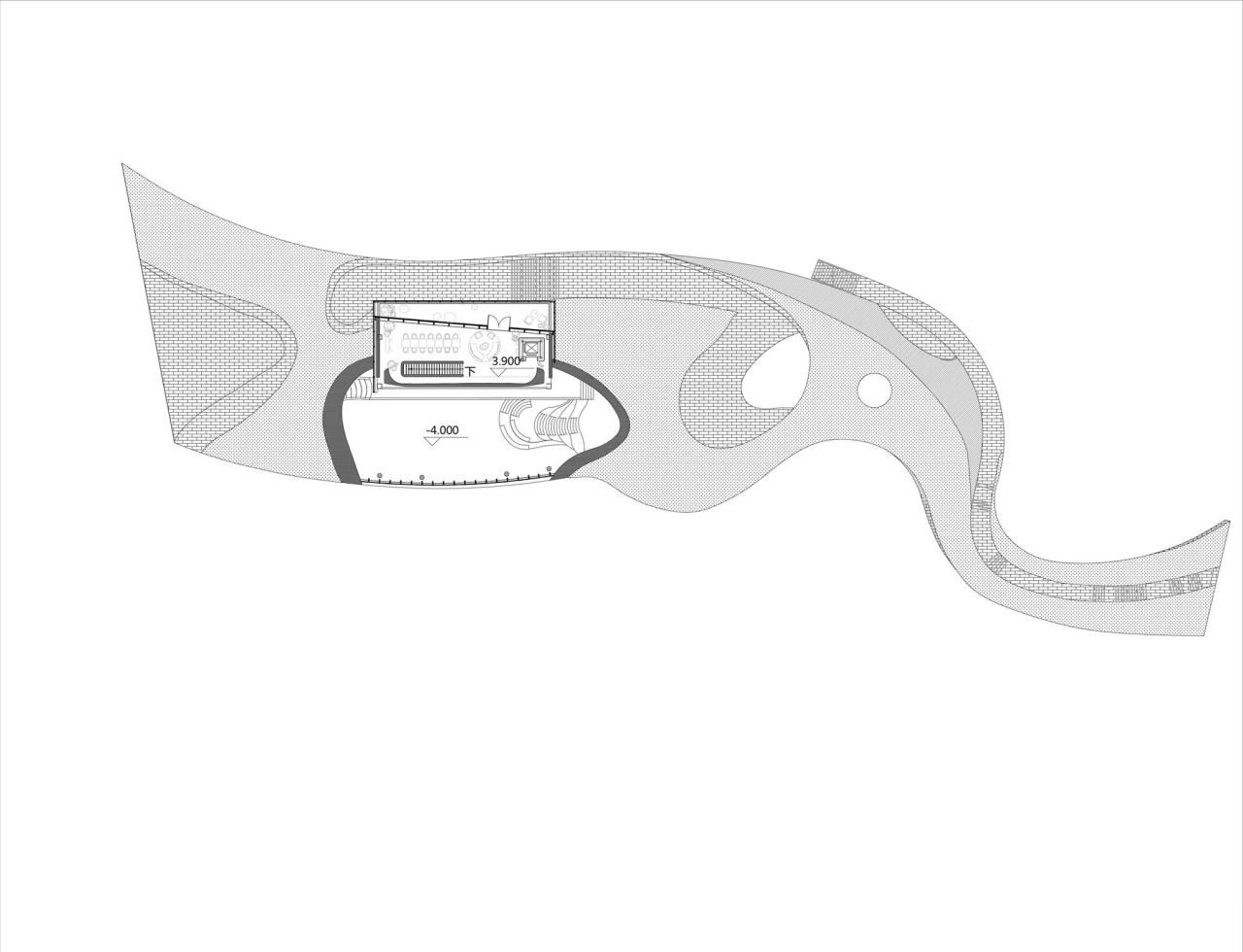 线索于自然的形态演绎建筑的‘模形’起始于山体和大地等高线的‘投影’;通过一条虫子蠕动的运动过程将地质运动改变大地地貌的力量对‘模形’进行了‘壳体’运动的演绎,虫的路径亦成为了建筑室内外‘壳面’的边界;在‘虫洞’的位置,嵌入了贯穿自然要素的观景方盒子。柔和的形态是展露其外的对外部山体的成像,刚性挠度的曲率线条则是内在蕴藏的源于令人敬畏的地表之下大地力量的含蓄侧露。整个建筑就像从地壳之下被自然造山力量挤压出地面似的,是地质空间的三维剖面。种植在壳体表面的绿植屋面,使得这个建筑仿佛不是被建筑师空降在这个场所里,而更像是原本存在,只是没有把附着在外的地表揭开被见而已。