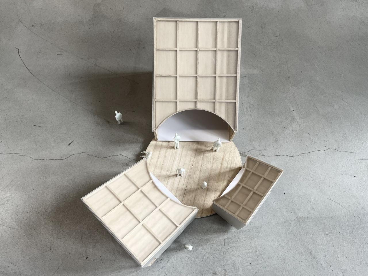 由于基地内原本就有着多条相互交叉的人行路径,建筑师便将既有动线作为切割空间的手段,划分出三个相对围合的初始体量。我们将解构后的“家”的三个基本空间:厅、室、卫分别置入其中进行重构,并随功能的不同,在面积上生出了小、中、大的差异。继而依照环境旋转角度,使其兼顾动线与沿街立面的视觉穿透性。