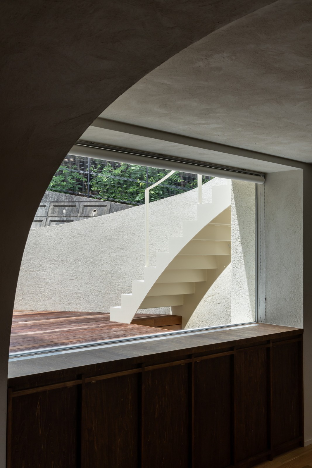 我们深入探索,创造了一种自然的形状,每次在室内移动时都能流畅地切换出墙外的风景。另外,通过为墙壁的内部和外部提供没有阴影间隙的粗糙纹理,我们相信以这种方式可以提供舒适感,即使场地位于城市中心。它还提供了一种倾向于在现代房屋中嵌入中世纪石墙的感觉。
