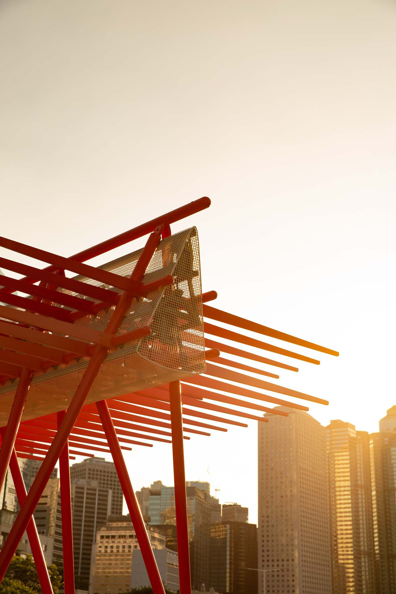 此艺术装置的灵感启发自它们的机械原理,一对双层的飞机翅膀与单车装置,伫立在草地中央,透过婆娑光影,营造出遮荫的公共空间。