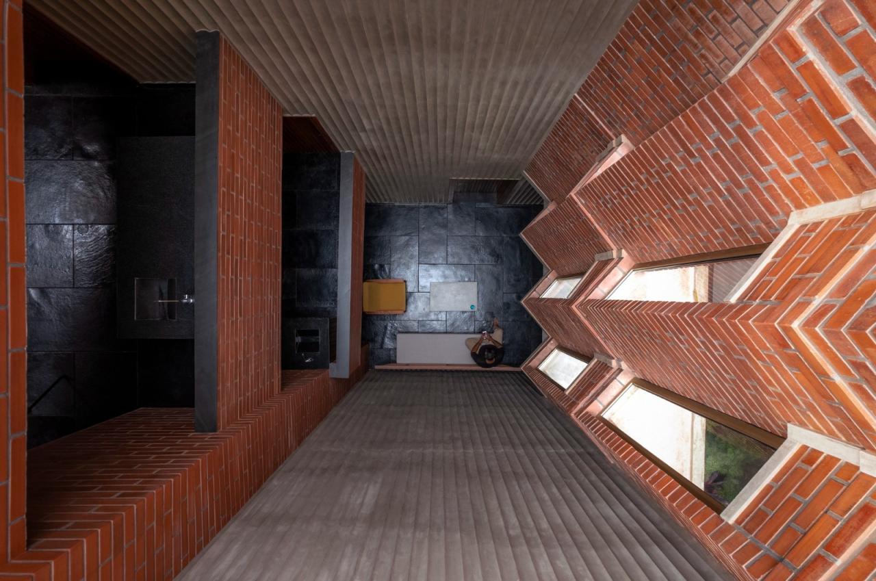 建筑表皮由数层材料层层包裹构成,以保持内层凉爽和绝缘。所有房间都有三层墙,外层砖块和内层砖块将红土砖砌体夹在中间。立面铺设砖块,排列成一定图案,创造出独特的表达方式,同时有助于缩小建筑规模。传统的瓦片斜屋顶的特点在这些砖的排列中得到了诠释,使人们走过的时候,建筑看起来就像在动一般。