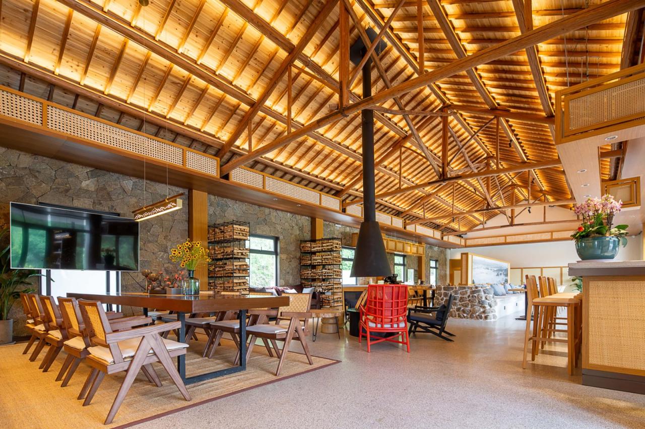 我们将餐厅、客房、员工宿舍、水吧、书吧、无边泳池、泡池等多种公共空间置于 改造房中,这样既符合功能流线、满足来客的生活需求,同时还能充分利用原始的 建筑,营造自然野趣的公共空间,也以此希望除了为来客提供舒适的居住体验,还可以提供更为全面、有趣的生活体验。