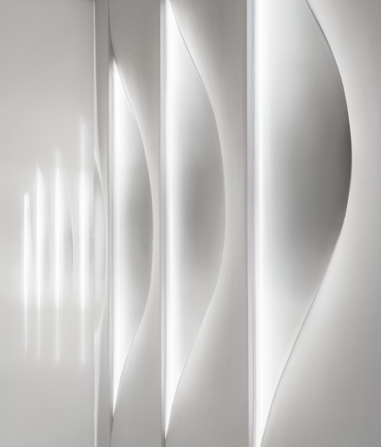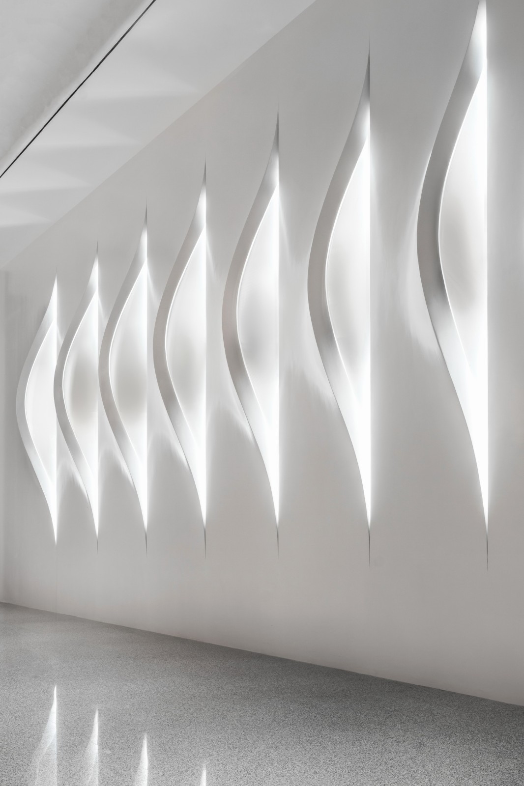 走进入口立面,纯洁光滑的墙体仿佛一个生命体的皮肤,生长出层层富有韵律、正在呼吸的“腮”。柔和的光影穿过,开合之间,打破了医美诊所内部与外部公共空间的边界,将两者有机融合在一起。