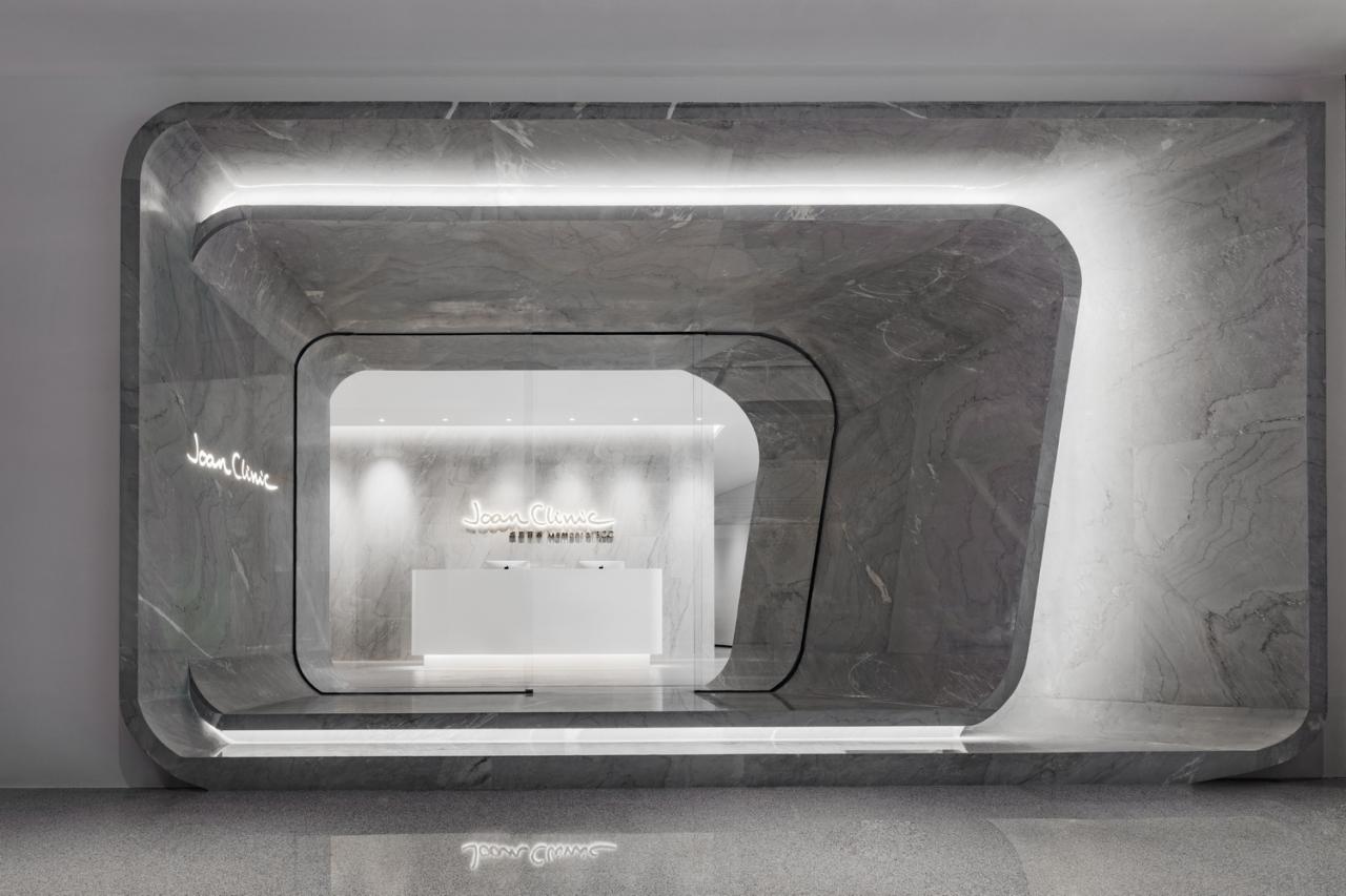 入口是一个由浅灰色天然石材围合而成的三维曲面的空腔,成为美颜中心内部与外部进行过渡和转换的介质,双曲面的围合与叠加,进一步演变成为吸纳人们进入的“容器”。