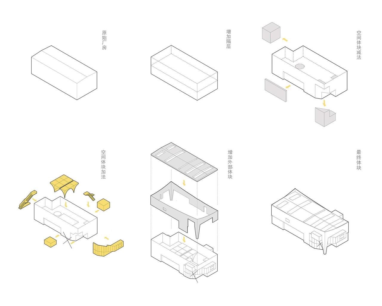 Flop的原有建筑是一栋彩钢厂房,外立面有腐朽和破损。但现场仍然保留完整的结构框架。我们谨慎地把这栋工业厂房的改造看作为一个城市更新项目的一部分,我们希望老建筑可以被循环利用起来,而并不是完全的拆除。因此我们对原有结构进行了加固处理,去除原本已经严重腐朽的老彩钢金属墙面及屋顶。改造后的建筑体量和高度会和原有建筑一致。又因为摄影多空间功能的需求,我们将原本的通高厂房增加了二层的结构层,现有结构和原有结构分别独立承重。