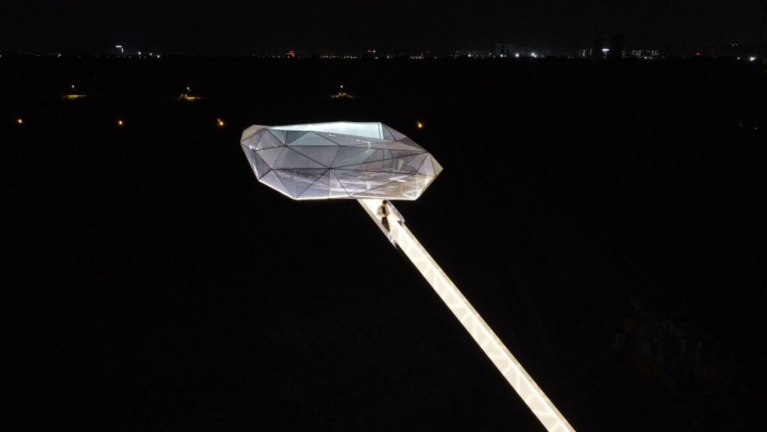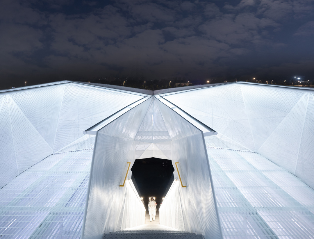 楼梯材料选择全反射的金属铝板,可以反射周围的环境,使得整个悬挑的结构消隐在环境之中。云的材质采用穿孔金属板,半透明的朦胧材质与农业生态自然进行了很好的融合,同时这也是工业化、智能制造的体现。