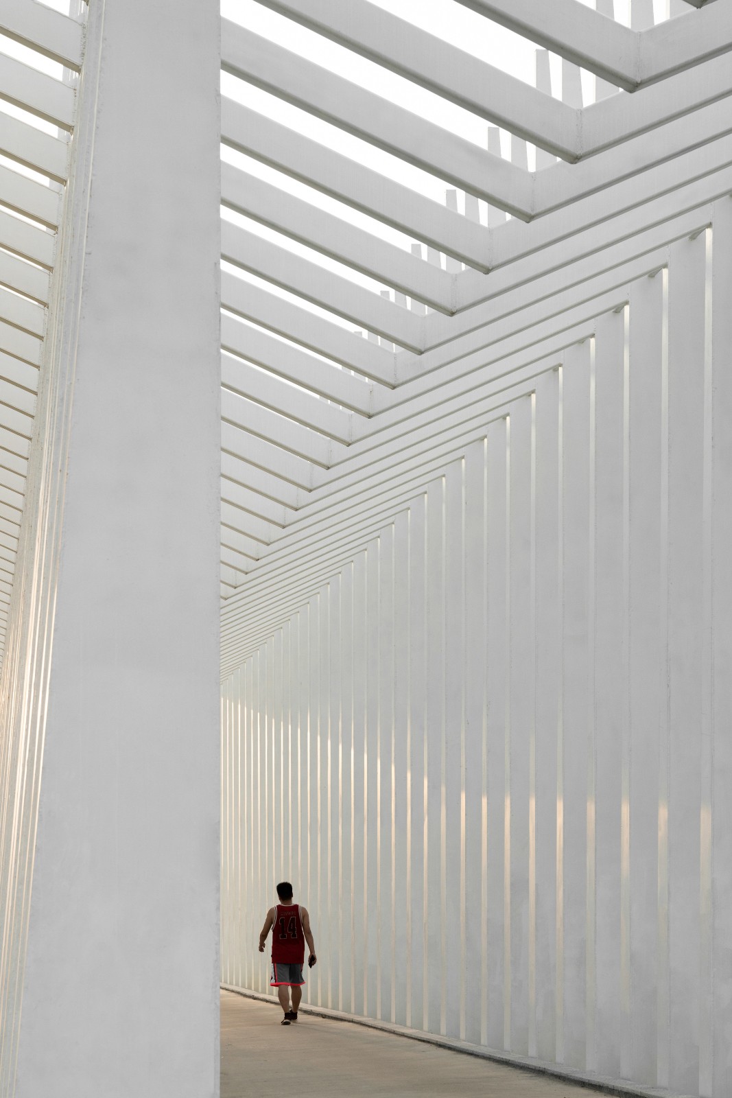 列柱的宽度与间距正好为一比一的关系,使人穿行其中时,视觉能完全被限定于两排柱子之间,而两侧的光线却能在间隙处温润的渗出,视线被导向尽端的风景,引人穿行。