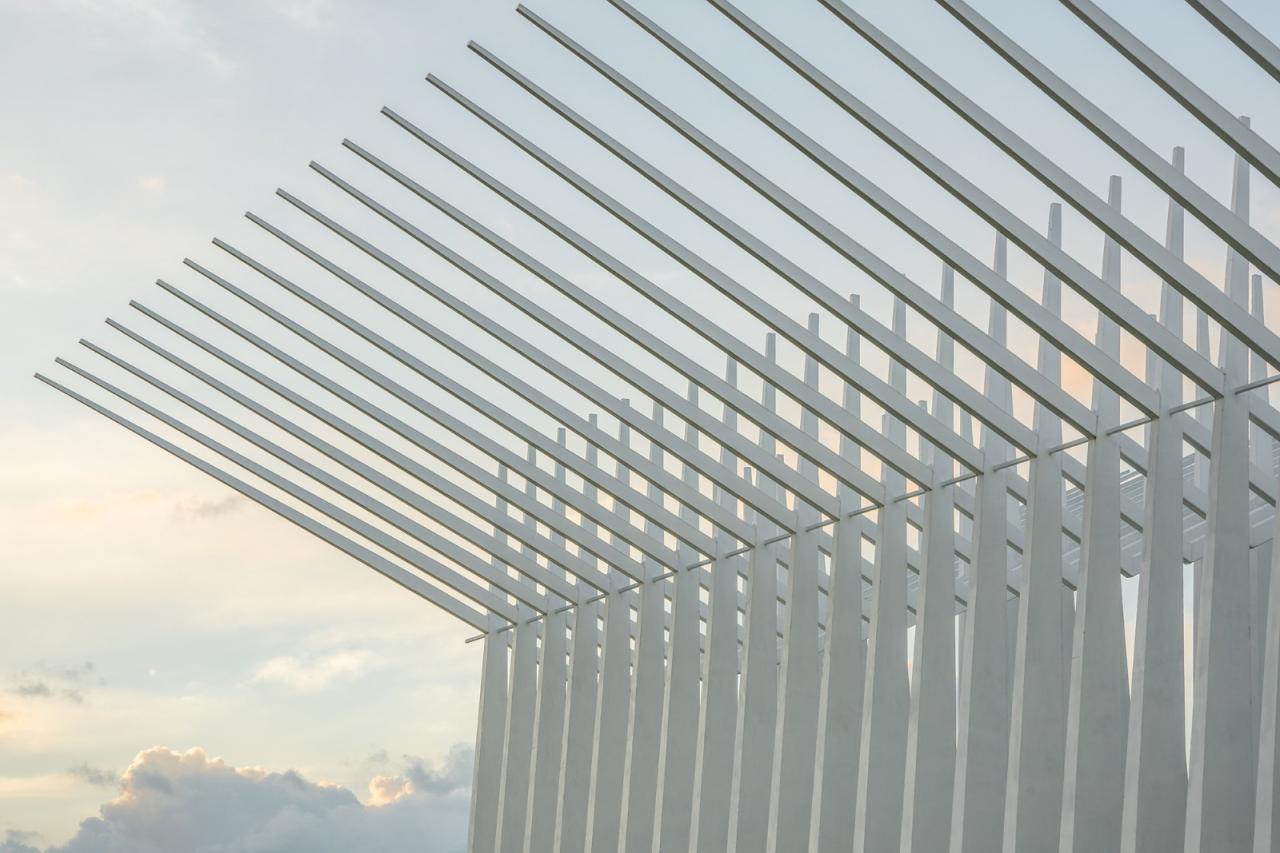 入口大门通过变截面的钢结构,形成一个向上生长的造型,以及一条长30米,视觉封闭,却可以落入日光的人行通廊。立柱与斜肋相交,组成稳定的力学形态。