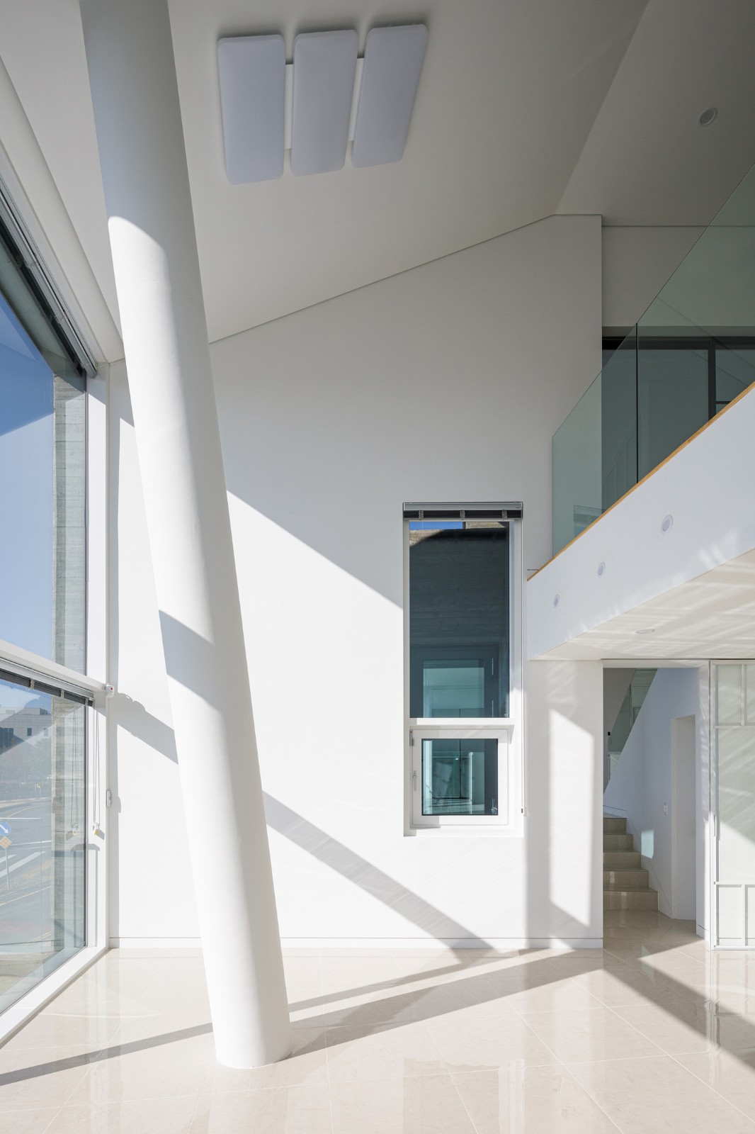 升降的 8 个房间:倾斜的场地给了面向南方的非常清晰的视野。所有的8个房间都能看到风景和充足的阳光。房子的入口在北面,有一个小的玄武岩竖起的围墙,给人以入口处的感觉,并在一定程度上保护了济州岛臭名昭著的风。门厅并没有给人任何通往主要空间的视觉钥匙,除非你转弯并登上几个台阶。生活空间是一个双层高度的空间,有一个倾斜的柱子支撑着 4 楼的图书馆。再往上走几步就到了厨房和餐厅,当你通过更多的台阶时,你会被引向未来的一个孩子的房间。这种通过台阶和坡道的上升一直持续到顶部,那里有图书馆,可以看到太平洋的美景。南北轴线的图书馆有阶梯式的座位,到了北面提供了一个通往阳台的门,在那里可以看到哈拉山的景色。坚实的叠浪姿态已经敲定。