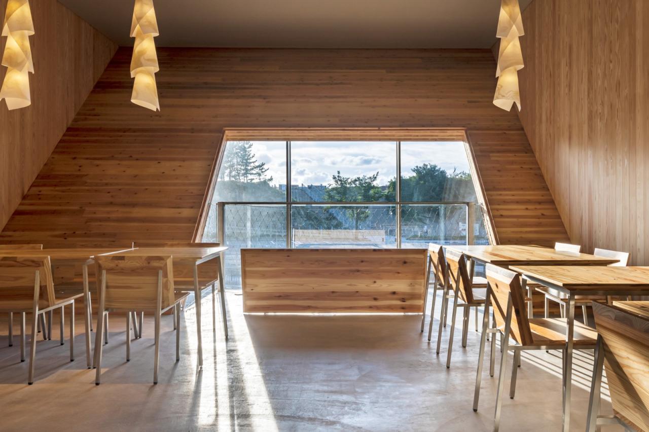建筑师为了向以民间工艺(“民艺”)文化而闻名的鸟取市表以敬意,在室内元素中融入了当地工艺。椅子的设计采用了交叉层压木材,而吊灯则由洒有当地沙子的和纸制成。