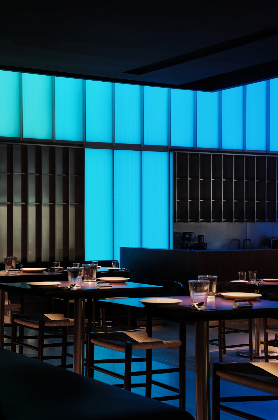 于是在此次空间策划中,设计团队经过反复的结构推演,以“消失”作为线索,在整体建筑内搭建桁架,配以桥梁拉索的构造形式,打造出长达8米的无底部支撑机构,将后厨区悬置二层,巧妙地划分出餐区空间与功能空间,实现柱体“融入”空间。