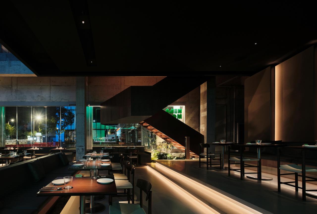 设计团队在餐区栽植了一颗5米的杨梅树,深度模糊了室内与室外的感受界限,在悬挑的巨构尺度下,景观绿意与工业风格的空间美学相宜。木色桌椅用具与室内外的景观呼应,营造人们与自然对话的场所,空间不再强调自身的存在,“消融”在自然之中。通透的玻璃立面搭配丰富的室内外绿植,消除了混凝土建筑体的内外边界,让置身其中的食客与自然亲密接触。