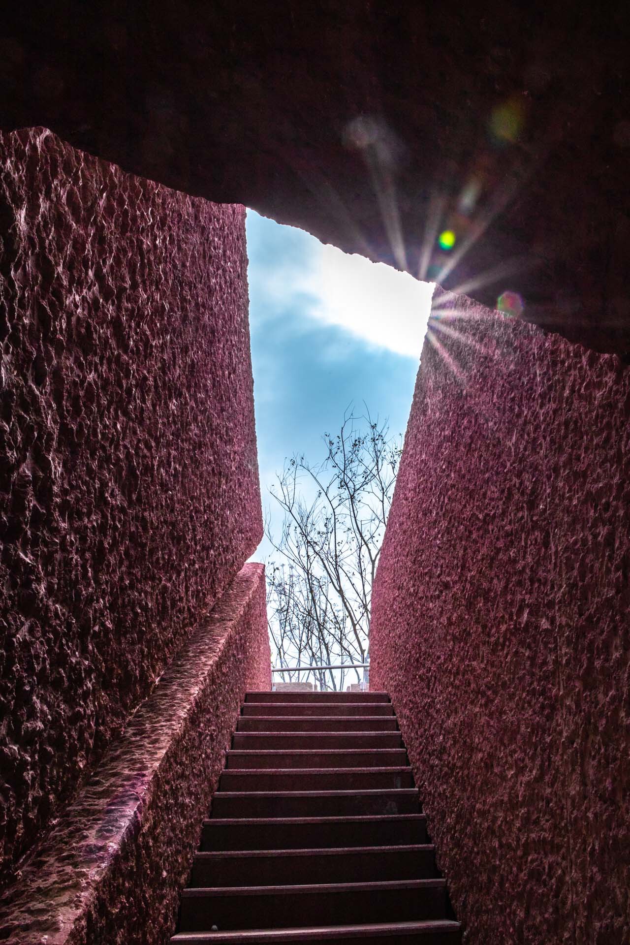 塑形为了让抽象的红岩充满力量,采取了刀削斧剁的手法来塑造形态,将大的体块干净利落的劈成若干小块后,自然形成一些裂缝,这些裂缝从建筑的立面延伸到了屋面,形成了很多自然的光槽。阳光挤进缝隙后,在室内和一些灰空间形成了丰富的光影效果,强烈的明暗对比也让体验者产生了江姐身处渣滓洞向往光明的那种精神感受。建筑的外皮有时候是剥离开的,为上山或者去屋顶的台阶提供了一些场所,这些逼仄的空间与中轴上宽阔的纪念场地形成了强烈对比,象征着崎岖的革命道路和美好的精神愿景。俯在地上的组群形态的确是与环境相融,但是建筑的纪念性仍然需要更强烈的提示,轴线上高耸的构筑物解决了这个问题,从基地的各个方向观察建筑,都会被它吸引,所以特意采用了材质的对比增加了对比度,形体的错落有致,偶尔带一点凌厉的气息也与江姐刚毅的性格暗合,在前侧水面的映衬下显得格外引人注目。