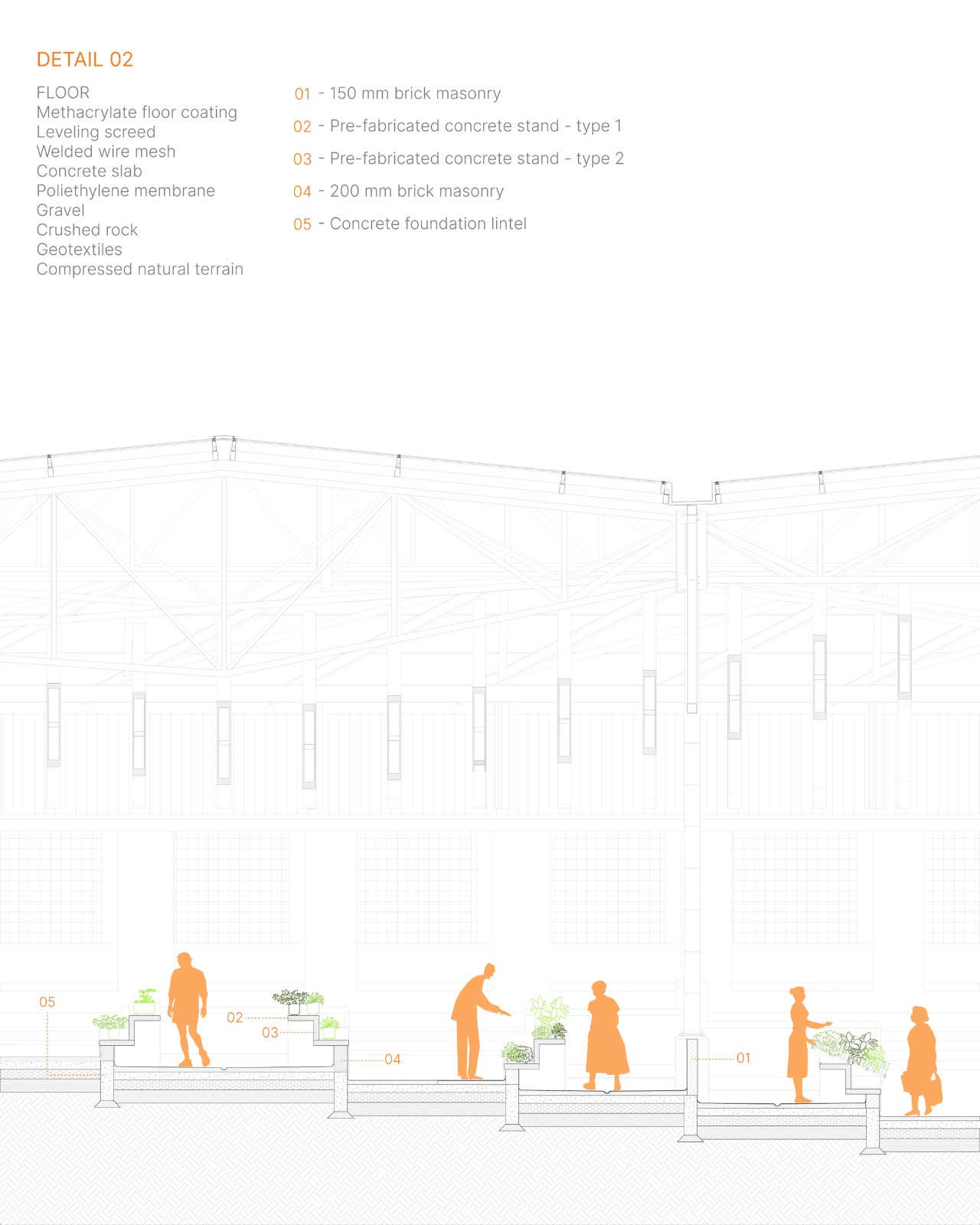 为了解决这些问题,建筑师需要在解决 3 米高差的同时将广场进行统一,添加和谐和温馨感。一个主坡道连接着仅有的两个主要入口,重新设计和调整了宽阔的外围走廊坡道,消除了大部分楼梯,并将所有坡道与较小的路径统一连接,预制混凝土制的核心摊位则布置在内部。