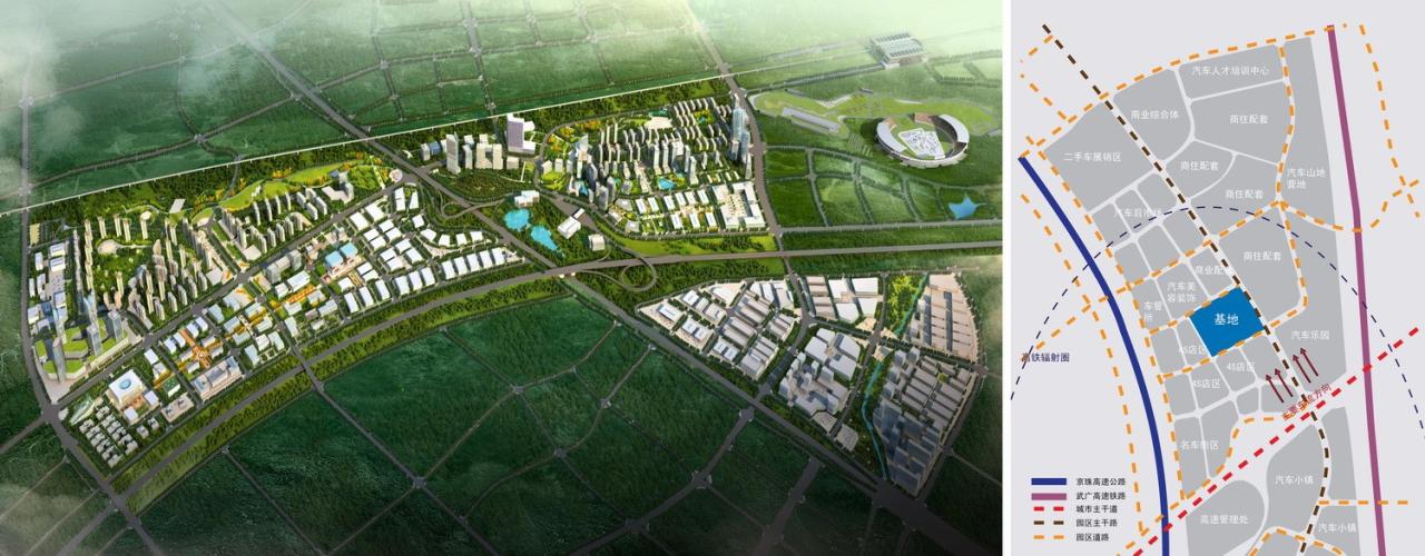 各地块项目业态间有相对重合和互补的部分,为了创造复合功能空间,增加地块之间的交通联系,并正确处理好各地块内部的车行、货运等流线。也为同时建设的汽博园服务中心提供了公共空间的优势,通过对景观轴线的塑造,形成公共广场与周边地块的景观资源共享。