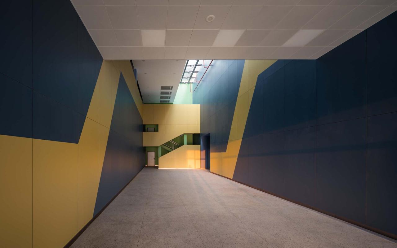 屋顶的天窗提供了天光,使得视线的联系和光线的串联成为一种时空的魔法,获得流线上某种探知的欲望。天窗之下是一部从一层连接到二层扩展平台及阅览室的公共台阶以及三四层平面的天桥,宽窄收缩变化的台阶成为学生课间阅读、交流及STEAM成果的展陈与演出空间。如此,各种的功能房间通过中庭、连廊和多重平台拓展了房间的维度,组织成垂直的立体活动空间,给学生交流和研学活动提供了一个复合的多元化场所。