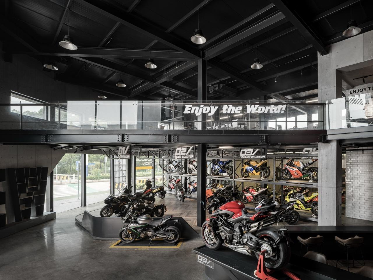 建筑内部以车流与人流两部分体验流线来划分,界定出岛型的展示区与径型的交通区域。同时流线链接着各种出入口,把入口展厅、咖啡厅、威士忌酒吧、机车美容、马力测试机房等空间串联起来。
