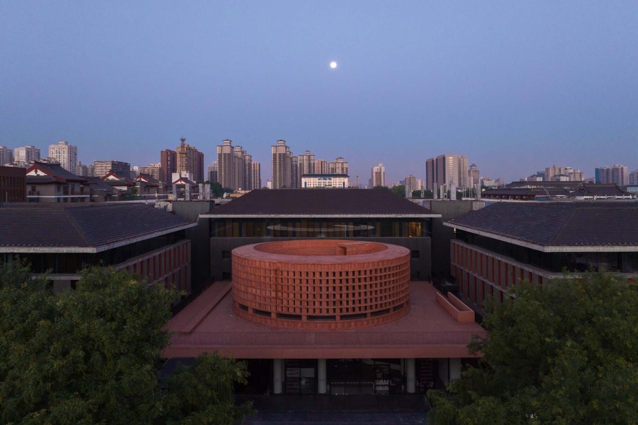 曲江艺术博物馆位于西安大唐不夜城,大雁塔的南侧。业主希望在博物馆的东入口处建造新的标志性建筑。扩建项目以“城市纪念建筑物”为设计概念的起始,不仅实现了博物馆扩建所需的文化与商业功能,也成为了城市肌理和社会历史的具象缩影。原有的博物馆空间将此次扩建的建筑围绕于其中。如恩为了尽可能地减少对原建筑的影响与干预,仔细斟酌扩建部分的体量和细节。