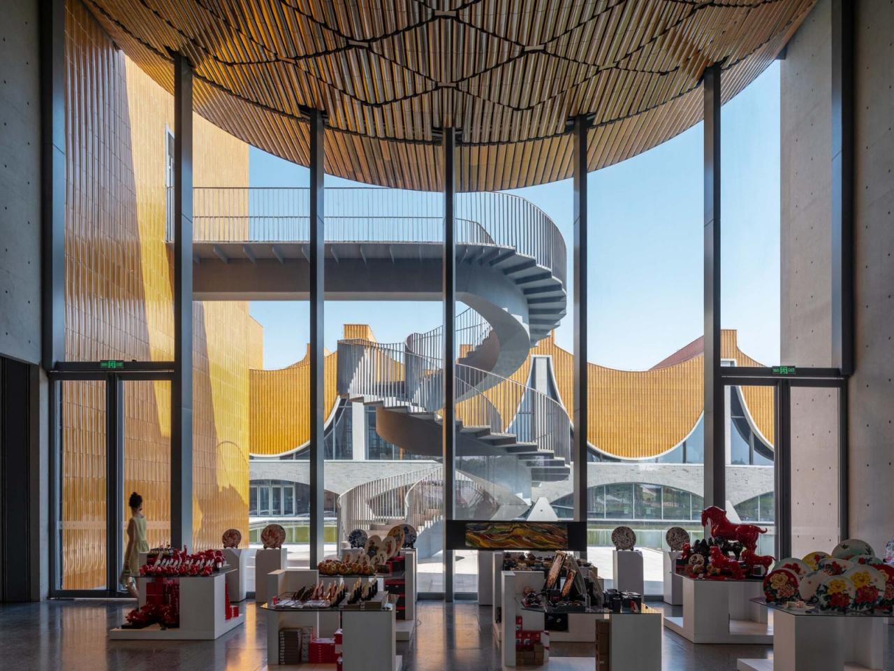 建筑主材的选用强调在地性的原则,即“洛阳造”。室内外大量采用改良后的洛阳三彩陶瓷挂板饰面,较好地缓解了清水混凝土建筑易给人带来的疏离感以及内部空间声学方面的缺陷,其中的吊顶《云帆》由126986个三彩陶瓷单元组成了迄今世界最大的陶瓷吊顶艺术作品。我们在设计过程中与洛阳当地的工艺美术家郭爱和、高水旺反复讨论试样,把传统手工陶艺与现代设计、加工技艺相结合,助推洛阳传统陶瓷产业的创新发展。
