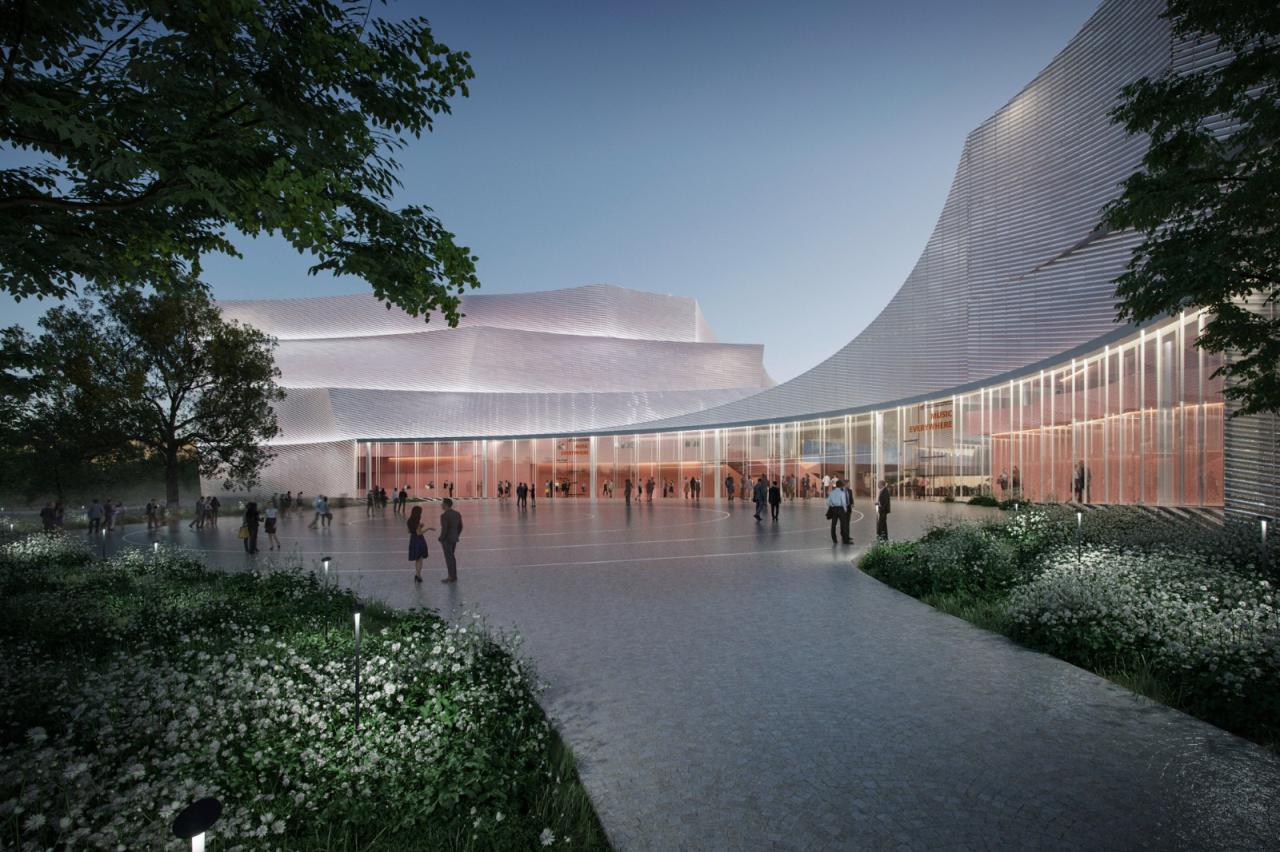 在塞尔维亚新贝尔格莱德爱乐音乐厅的国际设计竞赛中,伦敦事务所AL_A最终拔得头筹。这一项目将成为塞尔维亚首都贝尔格莱德(Belgrade)的新地标,并且也是当地近十年来最大的文化投资。音乐厅位于新贝尔格莱德历史悠久的塞尔维亚城堡附近,并将囊括多个表演、排练、和创意空间,其中还包含了一个拥有1600个座位的交响音乐大厅。AL_A建筑设计团队、VDLA景观设计师、AFA工程顾问团队、以及当地建筑事务所Zabriskie合作,与协调声学及剧场设计的Arup一起,共同打造了新贝尔格莱德爱乐音乐厅。