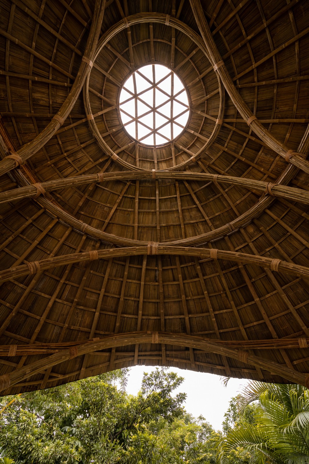 凉亭由几种不同种类的竹子和藤条所建造,并结合了多个拱门和环梁以创造一个底层框架来实现结构强度。簕竹被劈开以获得灵活度,从而得以聚在一起形成拱门;马甲竹则主要见于屋顶结构和屋顶垫;整合的藤条则被用于完成面和所有更为精细的细节。建筑师还在凉亭上侧设置了三个用于采光和通风的开口,并在施工过程中临时搭建了一个天窗,以照亮复杂格子的几何形状。