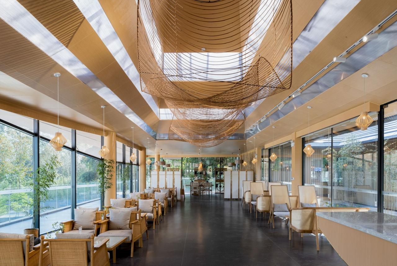 为了强化建筑的竹编文化属性,竹笋大屋顶的内部结构按照传统竹编骨架的方式设计,接待大厅的室内吊顶也采用长条状的木色铝板和半透明聚碳酸酯板编织而成,非常直观的展现了竹黄竹编的形式。出挑深远的大屋顶与厅外的环廊将屋外的绿色框成一幅幅图画引入室内,斑驳柔和的光线透过聚碳酸酯板进入大厅,光影随着时间在厅内舞动,形成第三重叙事场景。