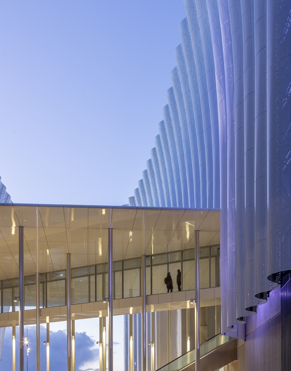 CO’Met 竞技场活动及会议中心有着轻盈、清晰的体量,并与传统大型功能性场所的形态形成对比,同时其特征也由自身向外发散。建筑流动、温柔的设计风格灵感来源于名列联合国教科文组织世界遗产的卢瓦尔河畔(Loire)的微妙氛围。其立面起伏的垂坠感包裹着整个竞技场区,并延伸至所有设施。光线、天空色彩的变化打破了建筑看似单一的外表。建筑立面“漂浮”在建筑物外围,并为其创造透明的外衣,隐约地勾勒着它的轮廓,同时也为空间体量制造了景深,由此让人们不止于第一瞬间的印象,而是可以不断地更新对建筑的认知。