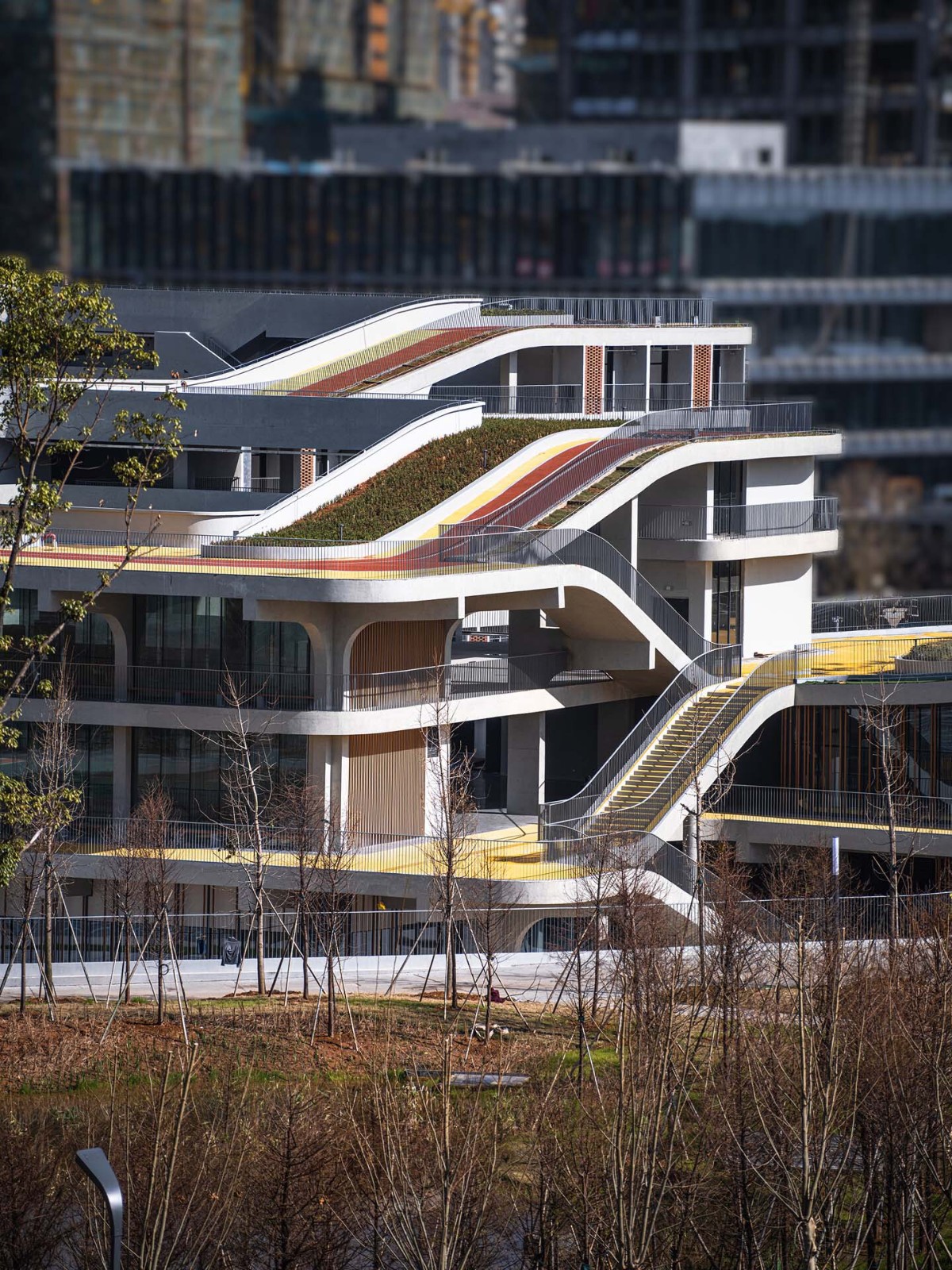 内径布置在建筑主体的功能之中,提供便捷高效的交通流线;外径与具体的功能结合,连接五个院子,并在层层跌落的屋面上与宿舍的内径连接,完成循环闭合。从任何一个体块都可走上这个循环,都能随路径漫游到建筑各处。红色的环形塑胶跑道配合粗粝的黄色丙烯酸,由运动中心出发延伸到北区宿舍,使得屋面从素雅的清水混凝土中凸显出来。伴随着两旁的绿化,将不同建筑间有限的空间最大限度地转化成为户外运动和活动的平台,等待着师生们的探索。